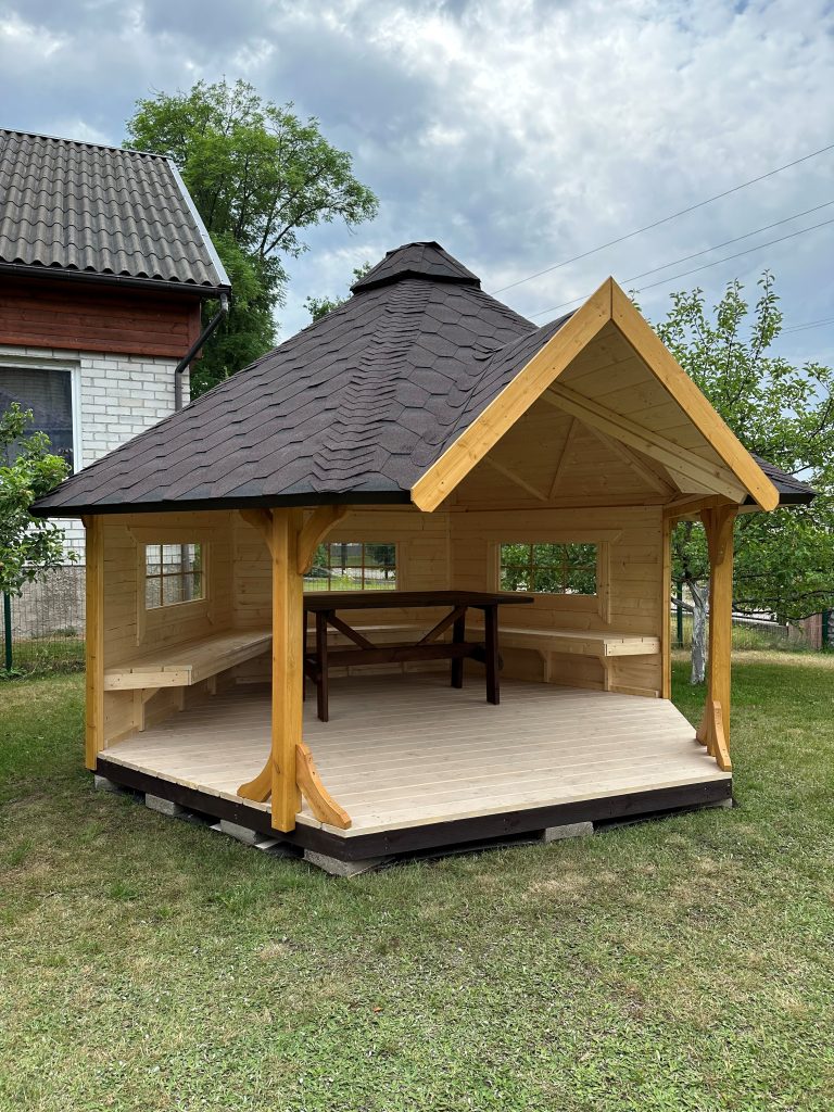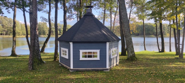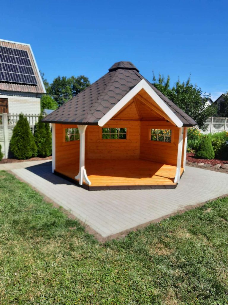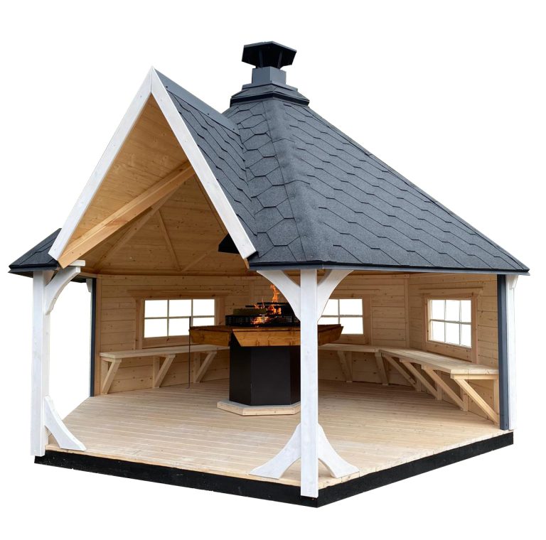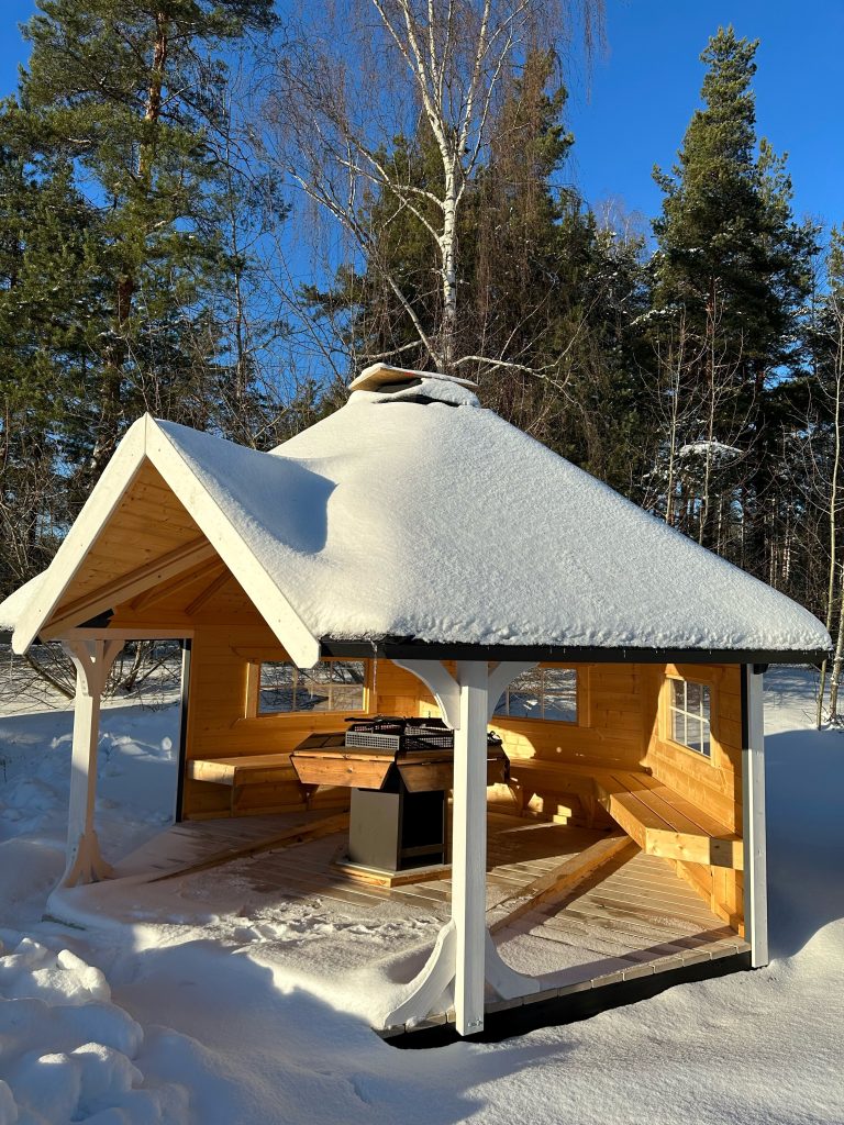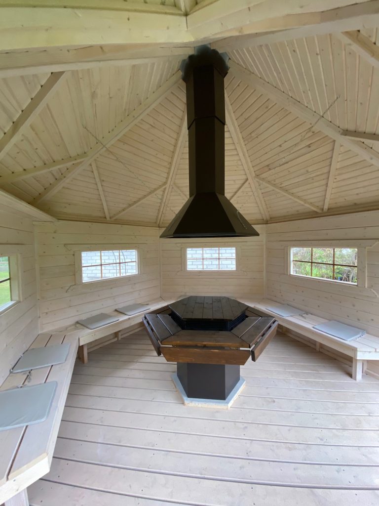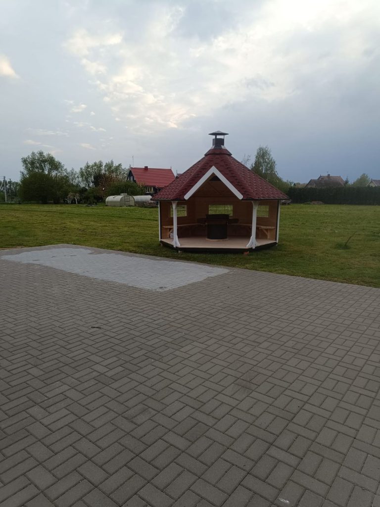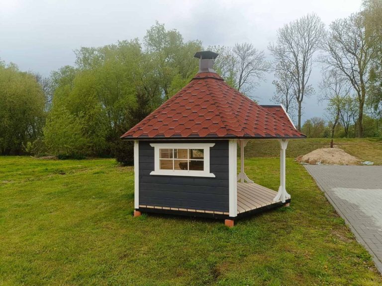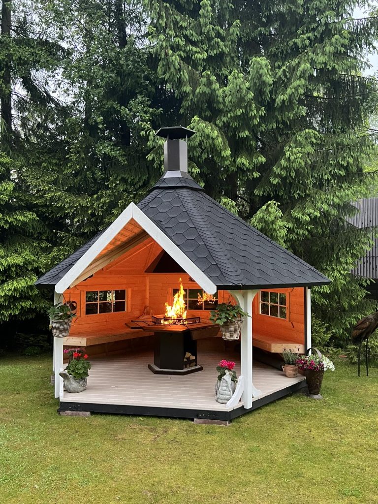 Öppet grillhus – den perfekta lösningen för dem som älskar grillning och socialt umgänge. Det är ett utmärkt samlingsställe året runt där du kan njuta av tid med vänner och familj samtidigt som du förbereder dina favoritmåltider. En viktig funktion är den stålgrillkaminen som är placerad i mitten av en pergola.