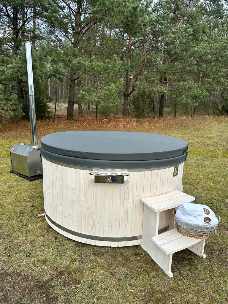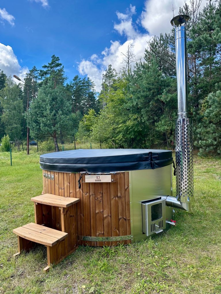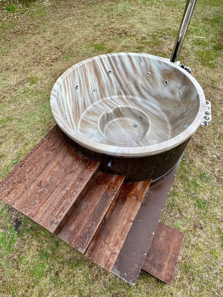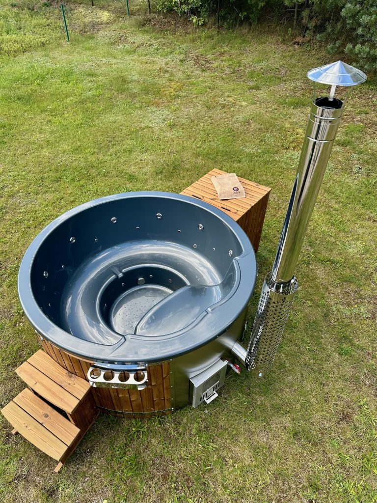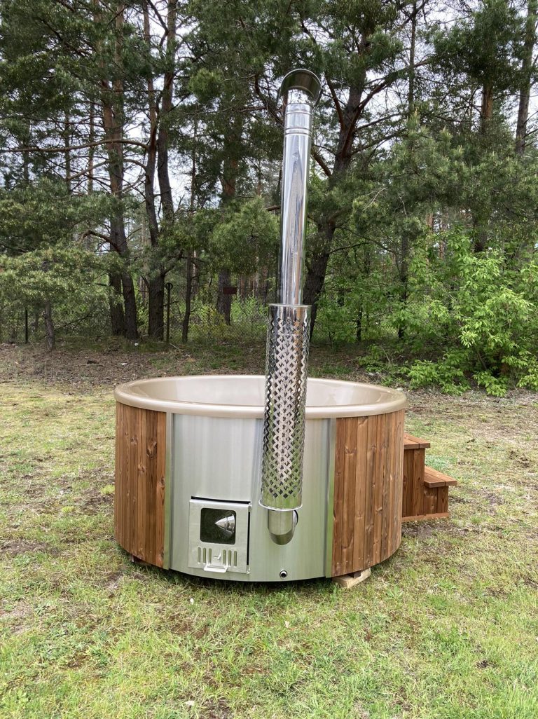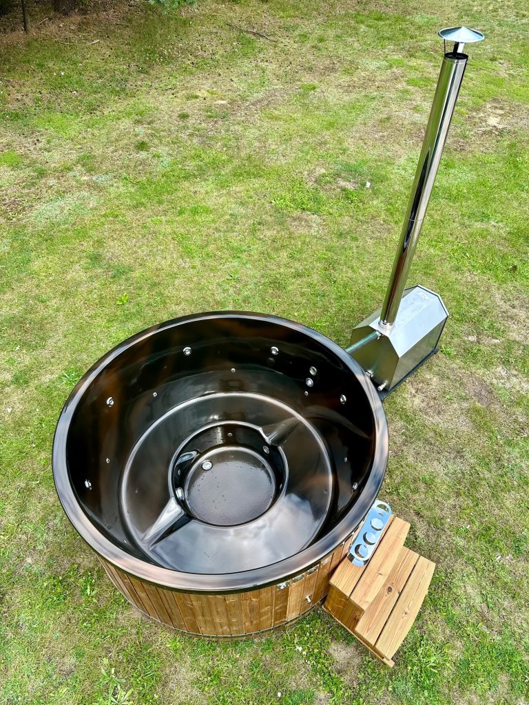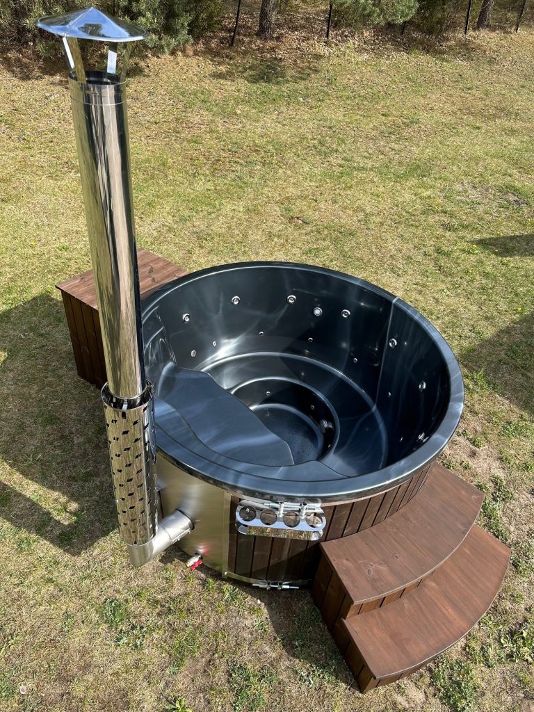 En extern kamin ger mer plats i badtunnan och är mer barnvänlig eftersom kaminen installeras utanför tunnan. Dock krävs mer utrymme för installation. Insidan av badtunnan blir enklare att rengöra, och askan kan tas bort utan att vattnet förorenas. Uppvärmningstiden blir något längre (ca 30 minuter mer än med integrerad kamin). Externa kaminer är också något dyrare, och vid risk för frost måste kaminen tömmas på vatten.
