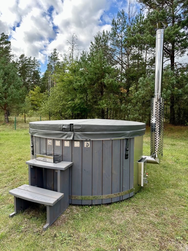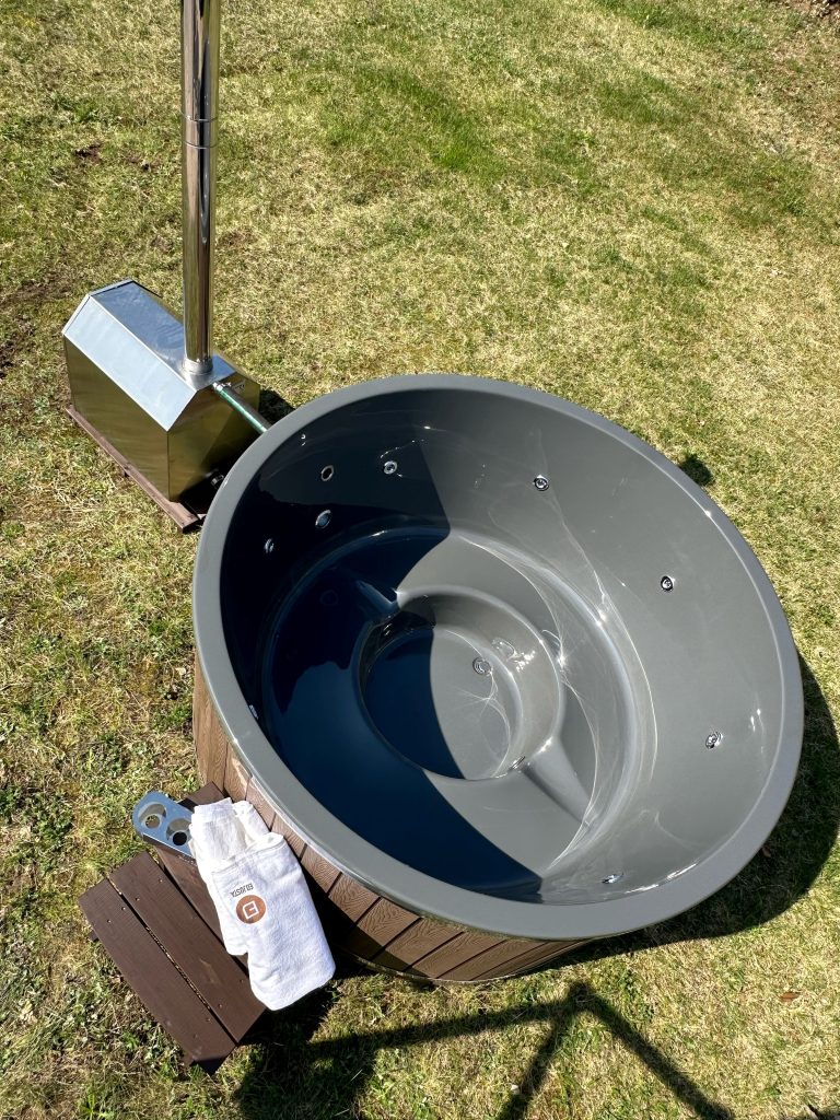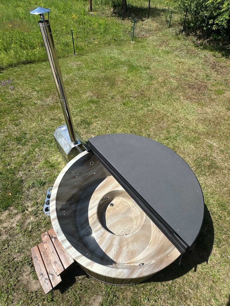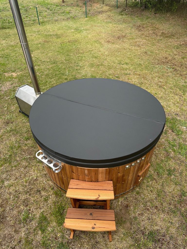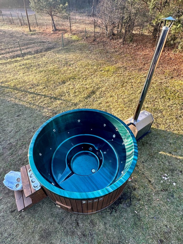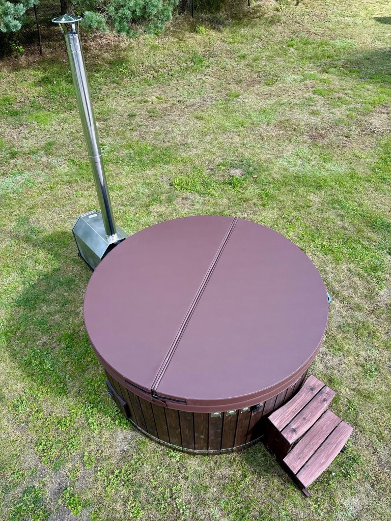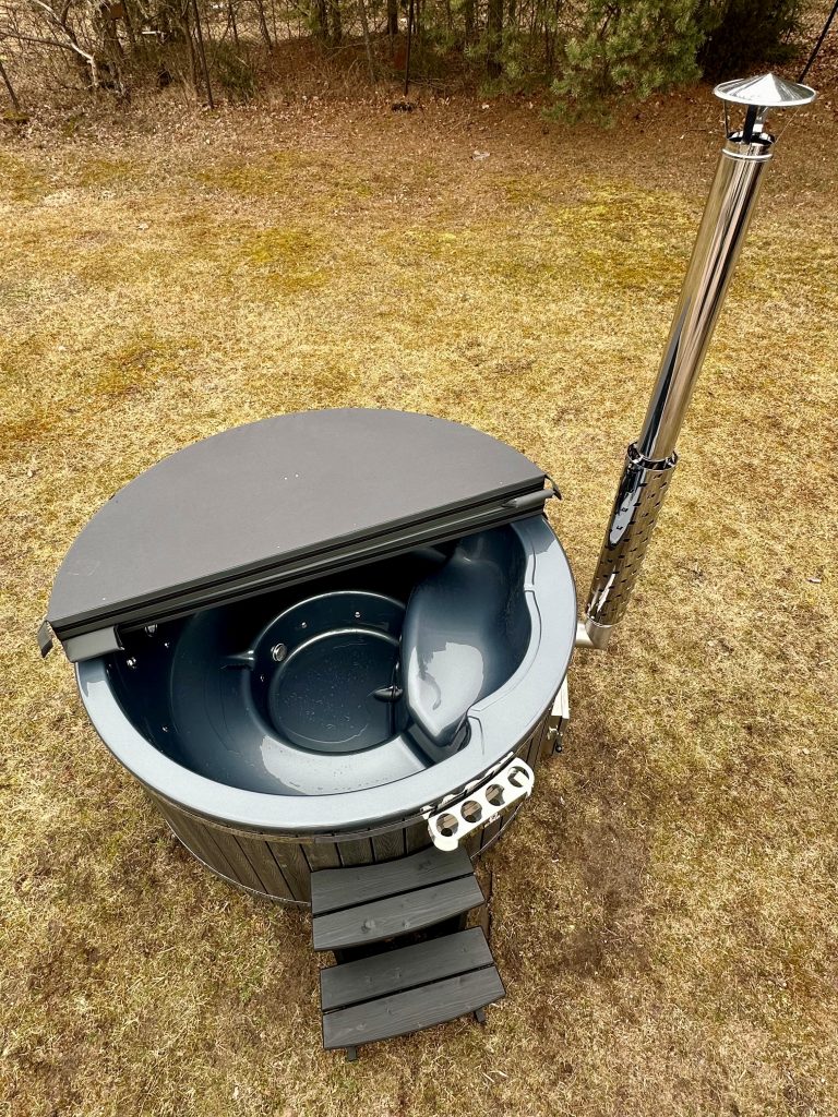 En extern kamin ger mer plats i badtunnan och är mer barnvänlig eftersom kaminen installeras utanför tunnan. Dock krävs mer utrymme för installation. Insidan av badtunnan blir enklare att rengöra, och askan kan tas bort utan att vattnet förorenas. Uppvärmningstiden blir något längre (ca 30 minuter mer än med integrerad kamin). Externa kaminer är också något dyrare, och vid risk för frost måste kaminen tömmas på vatten.