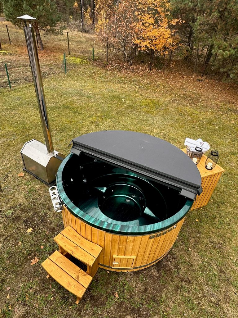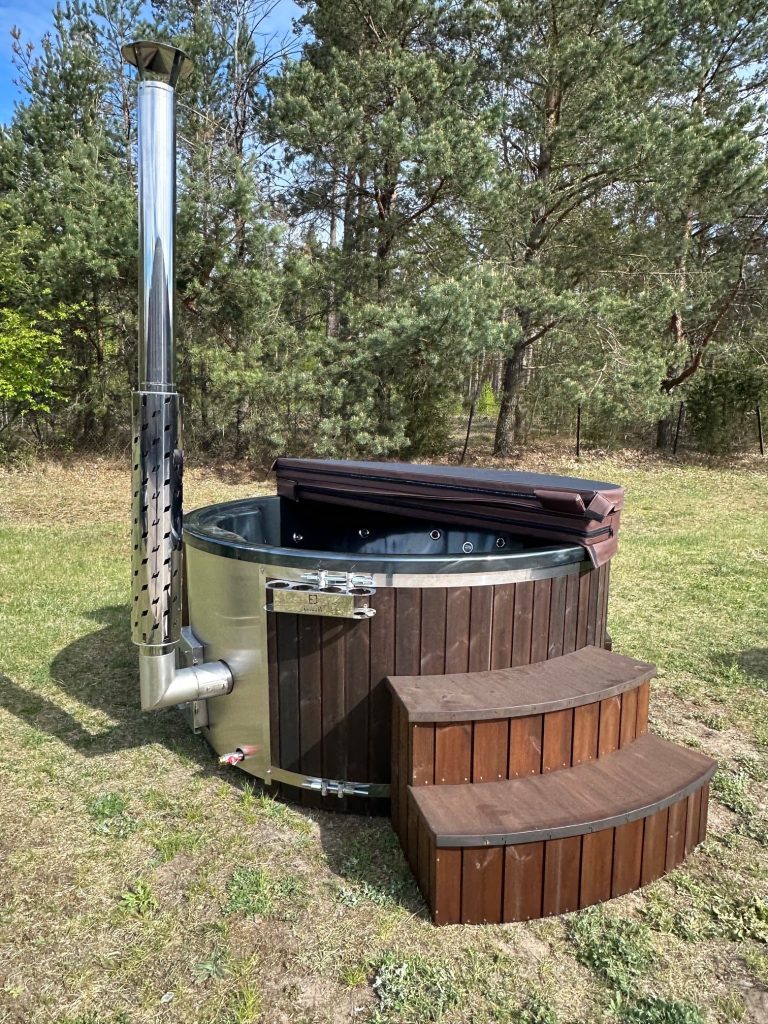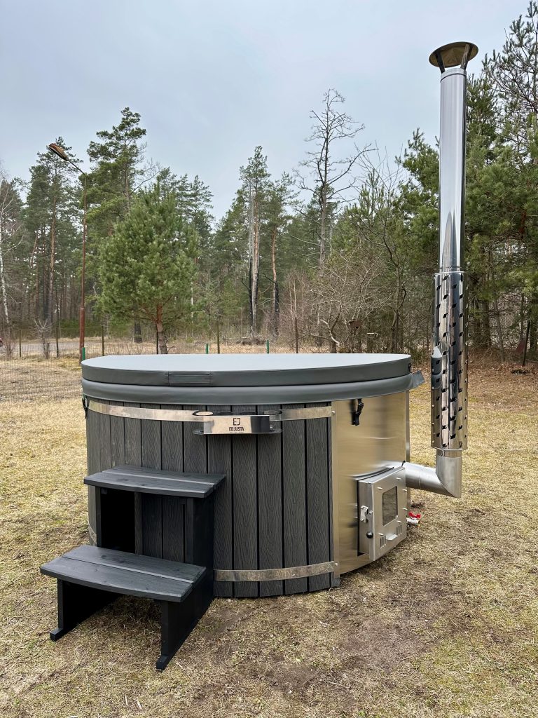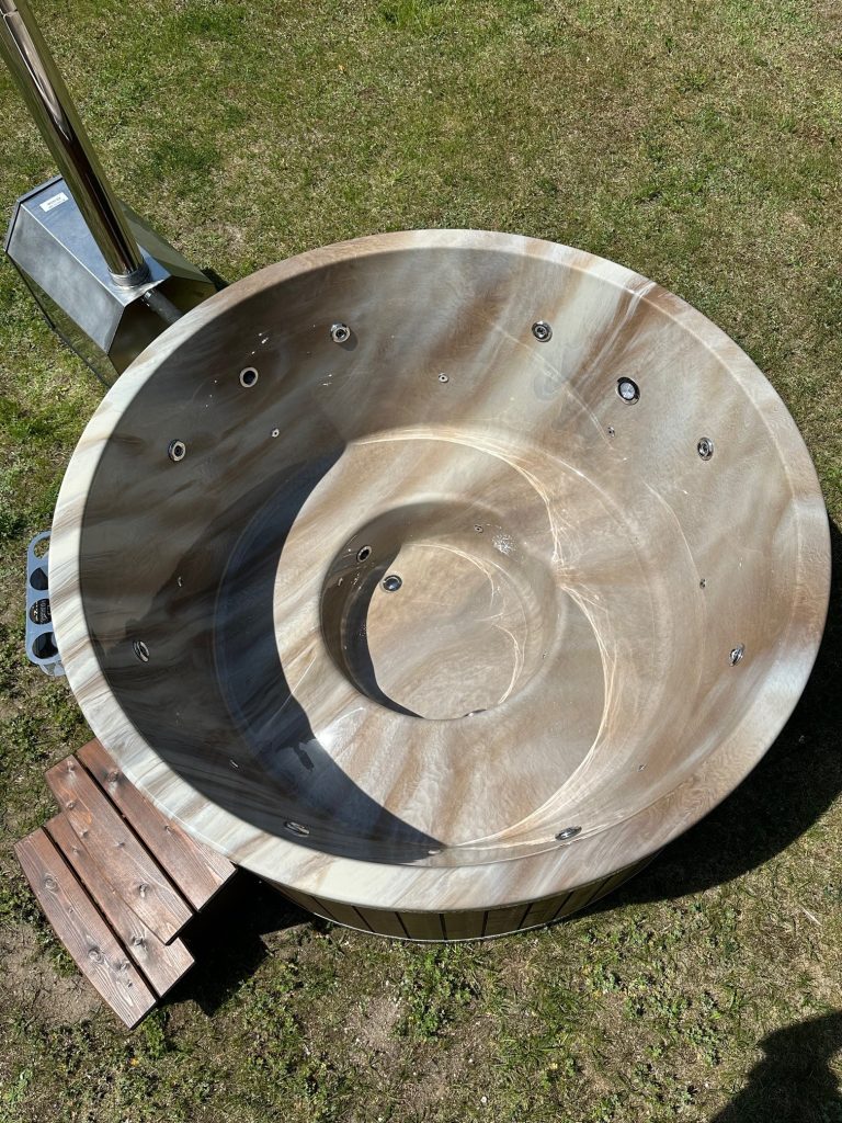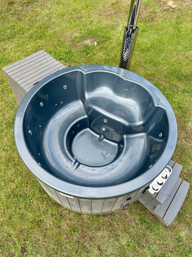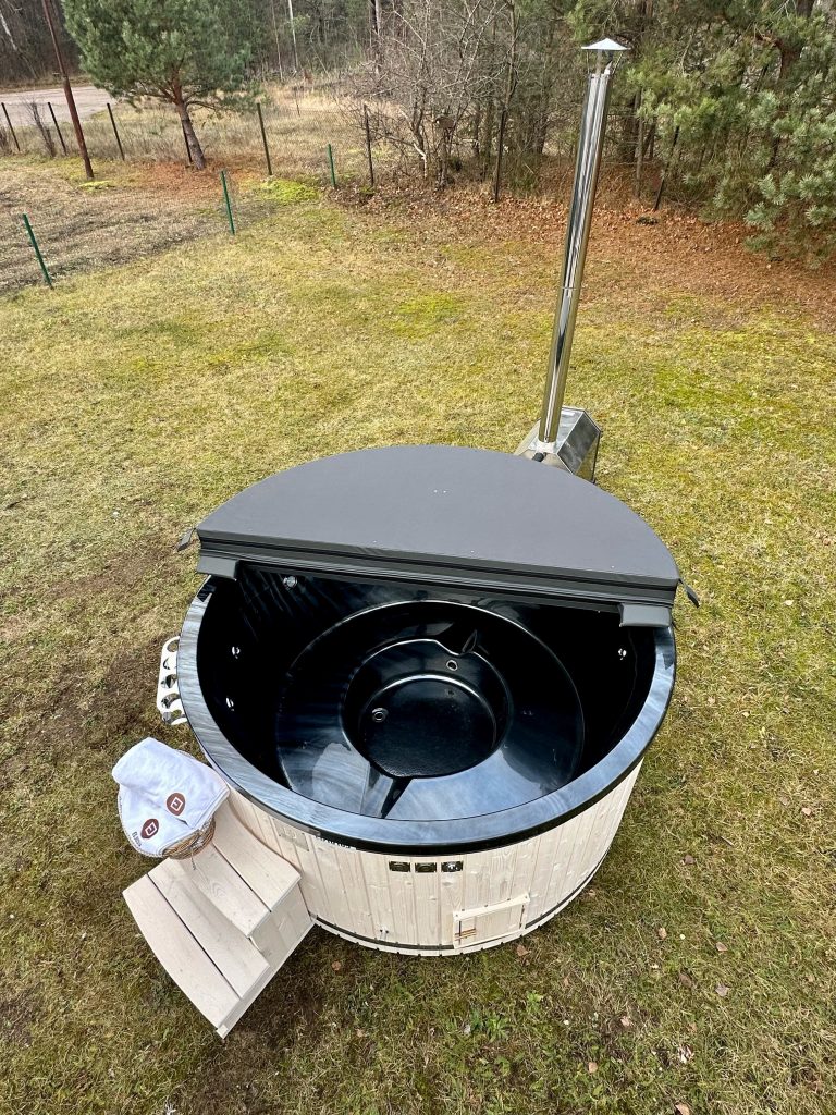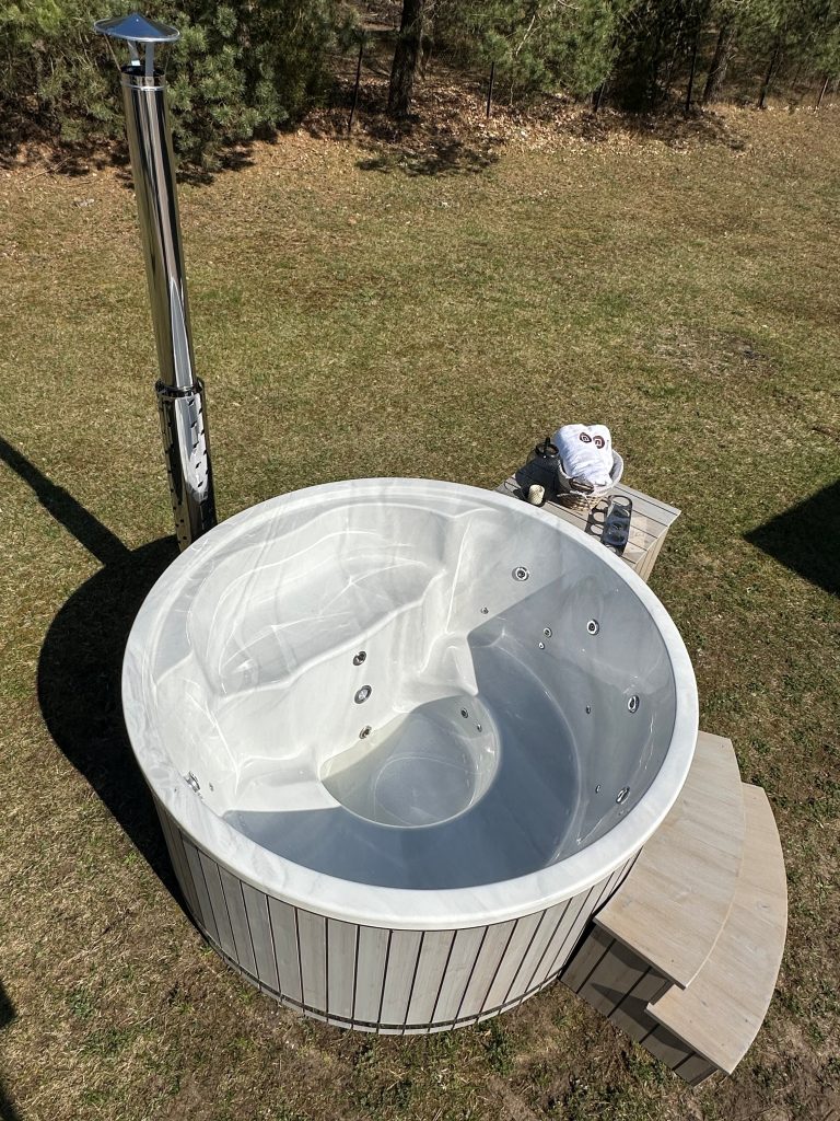 En extern kamin ger mer plats i badtunnan och är mer barnvänlig eftersom kaminen installeras utanför tunnan. Dock krävs mer utrymme för installation. Insidan av badtunnan blir enklare att rengöra, och askan kan tas bort utan att vattnet förorenas. Uppvärmningstiden blir något längre (ca 30 minuter mer än med integrerad kamin). Externa kaminer är också något dyrare, och vid risk för frost måste kaminen tömmas på vatten.
