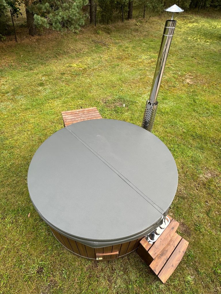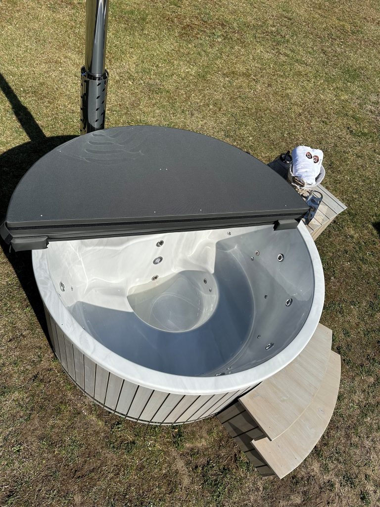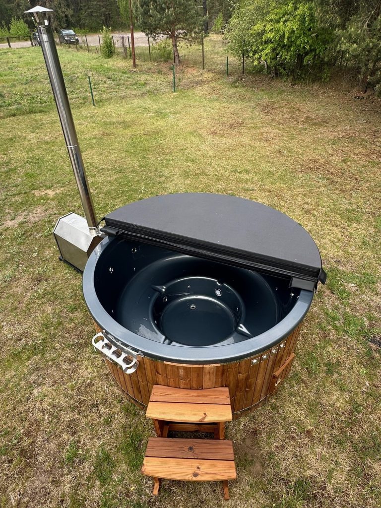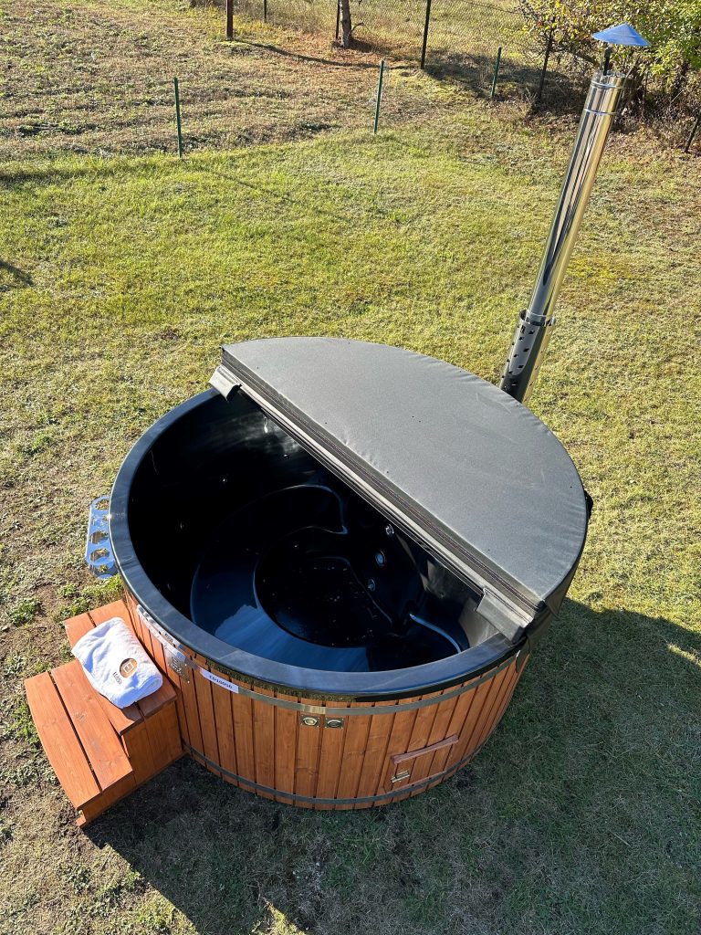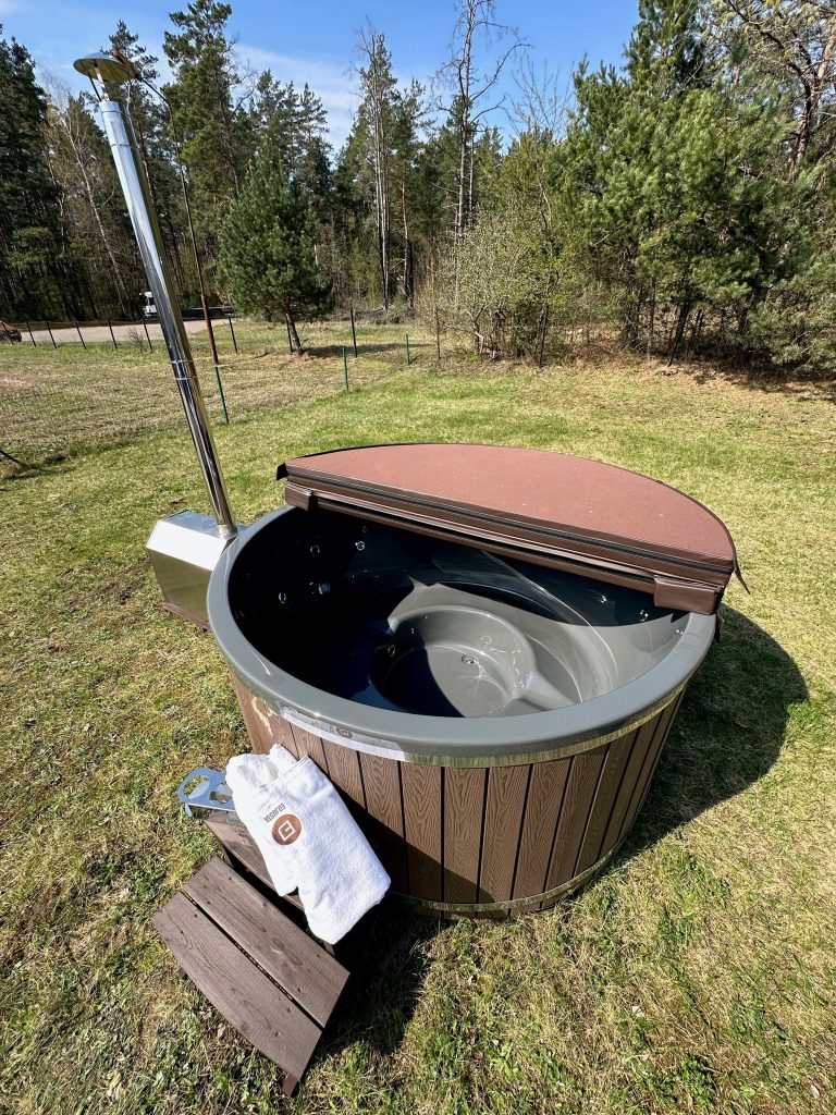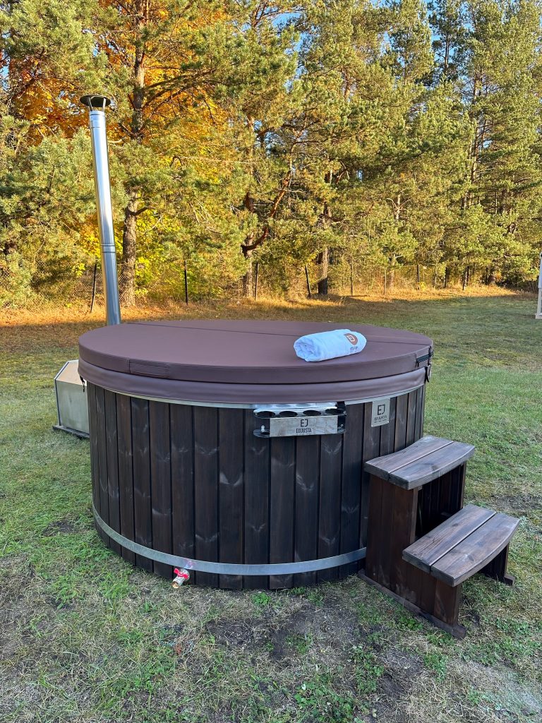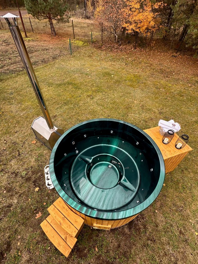 En extern kamin ger mer plats i badtunnan och är mer barnvänlig eftersom kaminen installeras utanför tunnan. Dock krävs mer utrymme för installation. Insidan av badtunnan blir enklare att rengöra, och askan kan tas bort utan att vattnet förorenas. Uppvärmningstiden blir något längre (ca 30 minuter mer än med integrerad kamin). Externa kaminer är också något dyrare, och vid risk för frost måste kaminen tömmas på vatten.