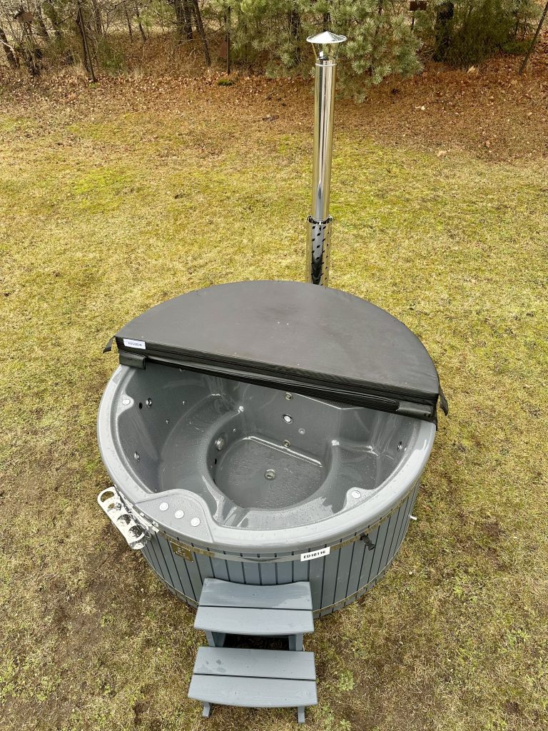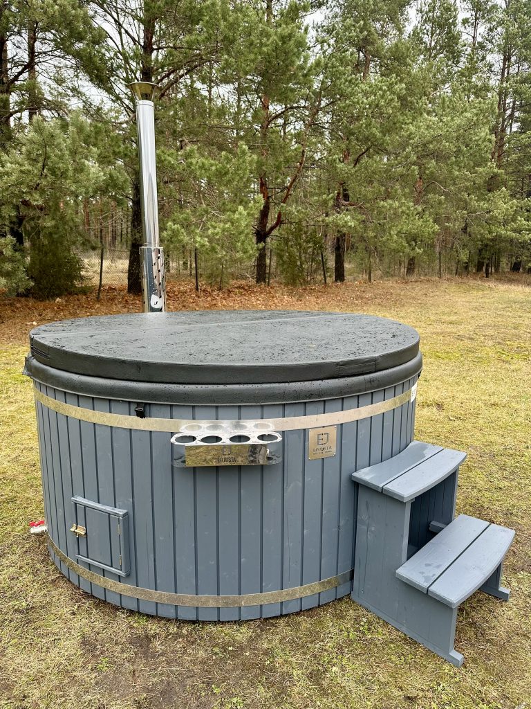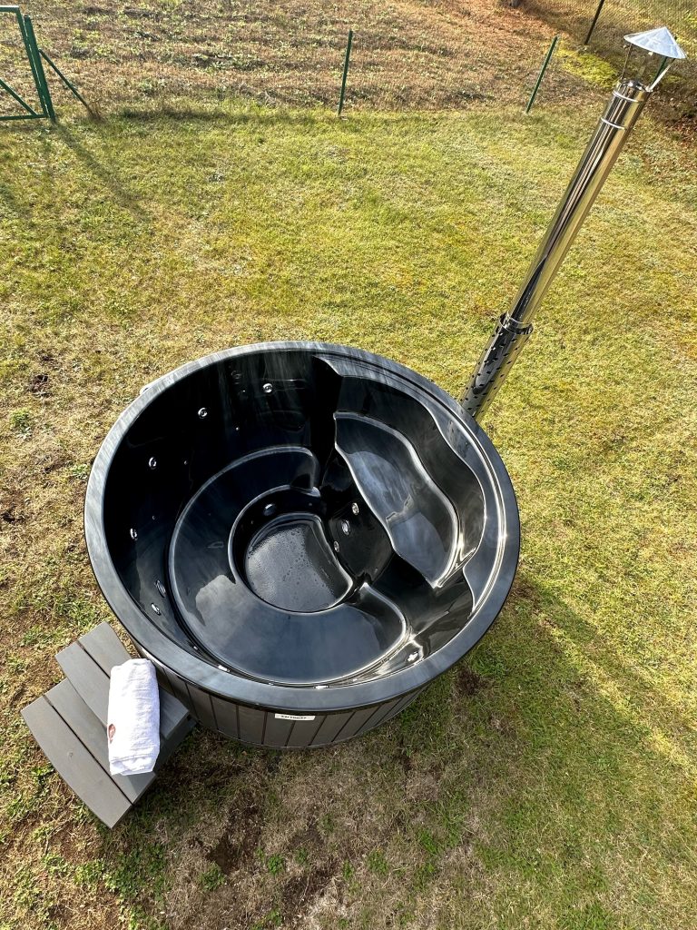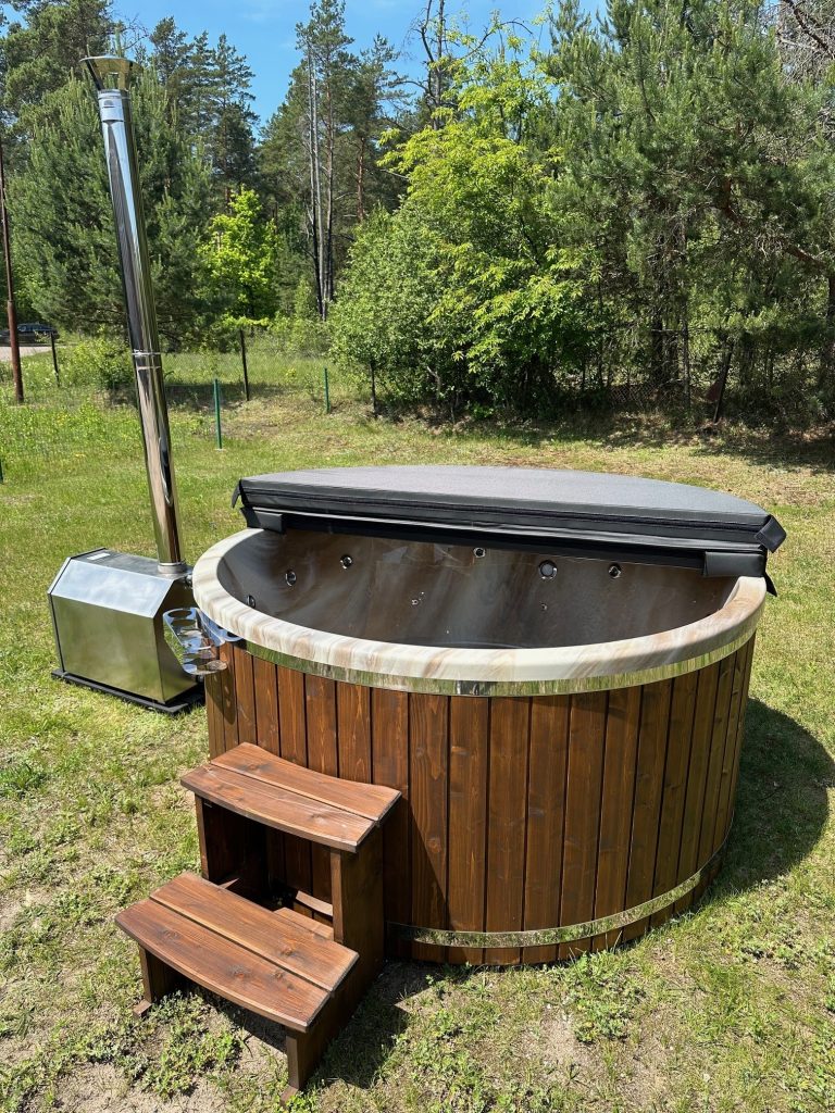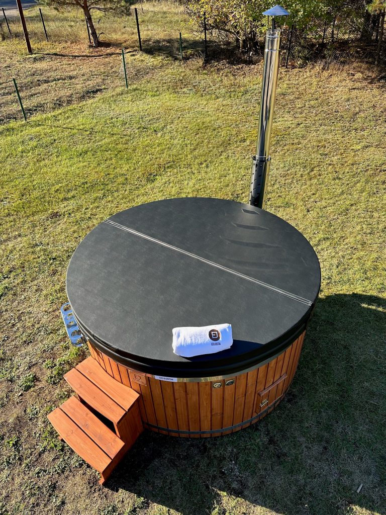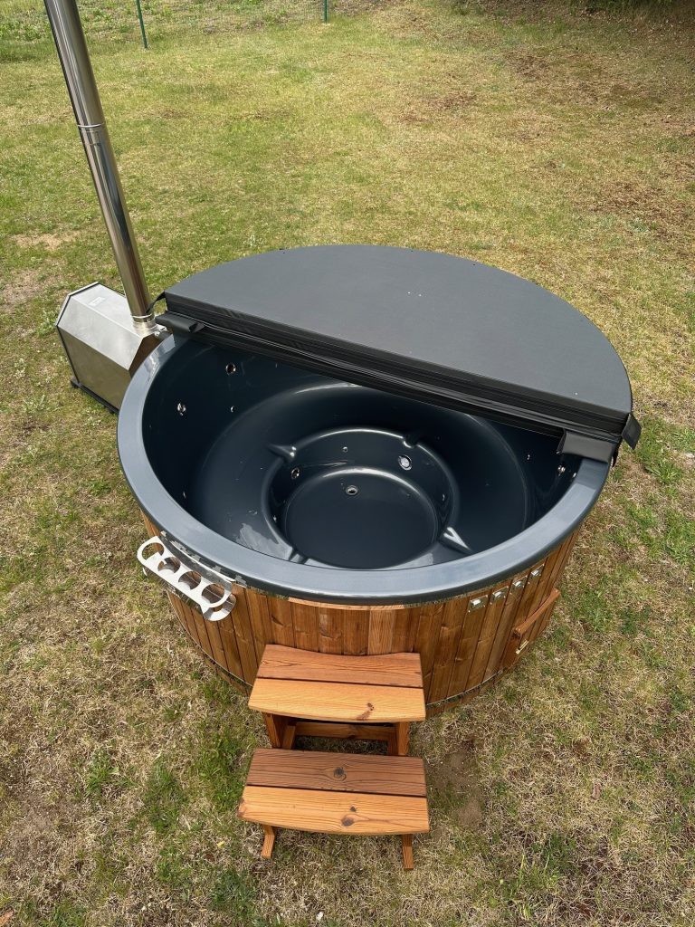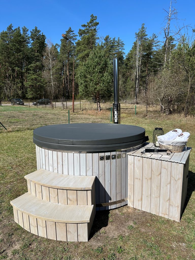 En extern kamin ger mer plats i badtunnan och är mer barnvänlig eftersom kaminen installeras utanför tunnan. Dock krävs mer utrymme för installation. Insidan av badtunnan blir enklare att rengöra, och askan kan tas bort utan att vattnet förorenas. Uppvärmningstiden blir något längre (ca 30 minuter mer än med integrerad kamin). Externa kaminer är också något dyrare, och vid risk för frost måste kaminen tömmas på vatten.