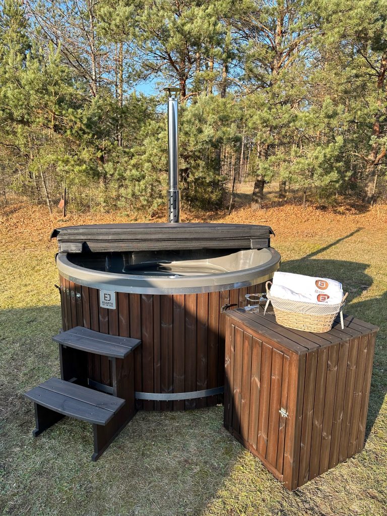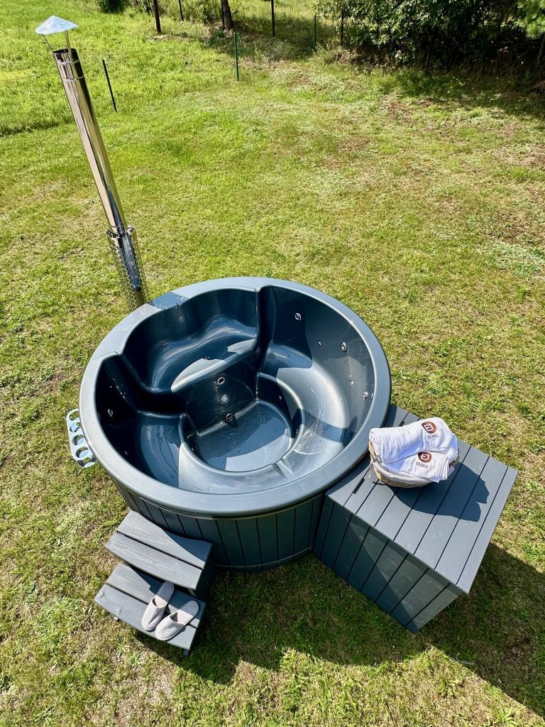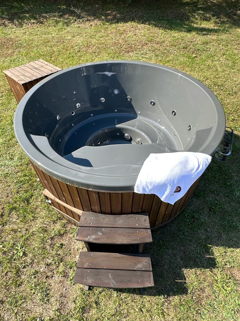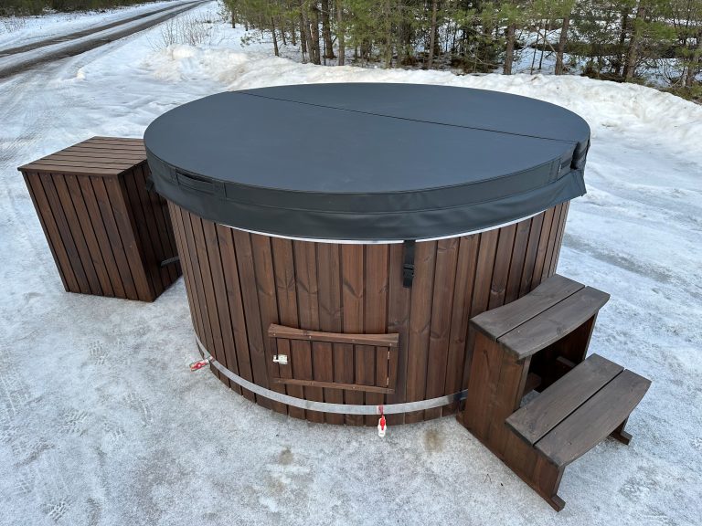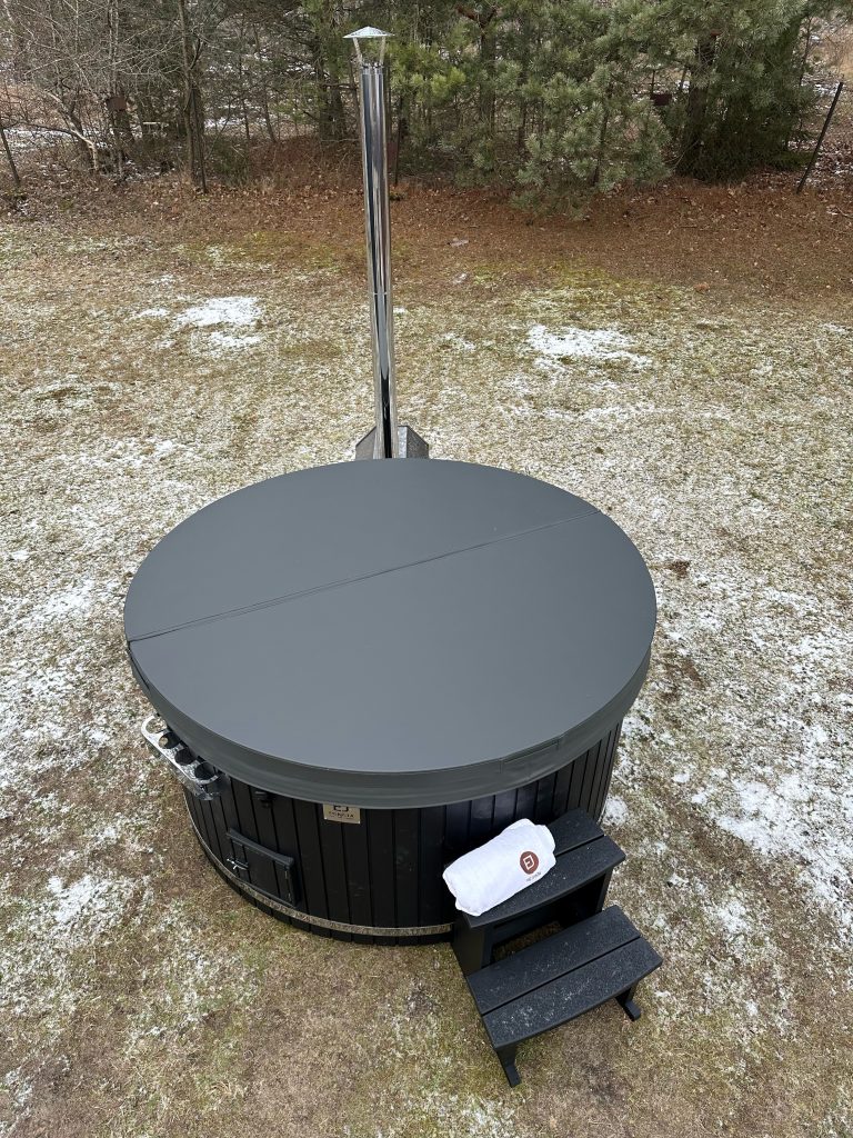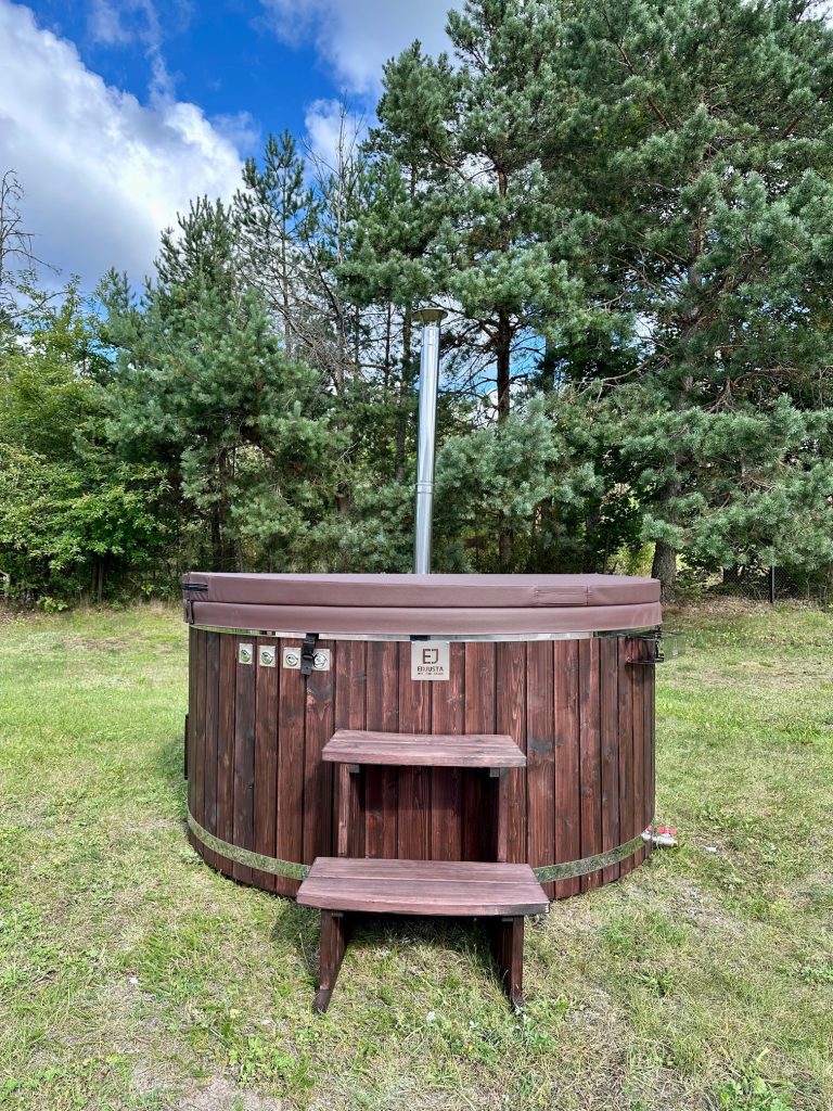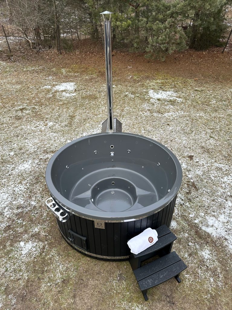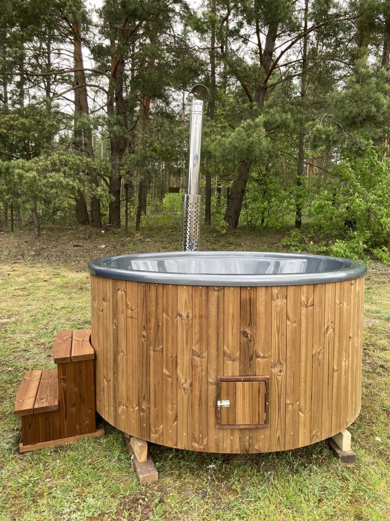 En extern kamin ger mer plats i badtunnan och är mer barnvänlig eftersom kaminen installeras utanför tunnan. Dock krävs mer utrymme för installation. Insidan av badtunnan blir enklare att rengöra, och askan kan tas bort utan att vattnet förorenas. Uppvärmningstiden blir något längre (ca 30 minuter mer än med integrerad kamin). Externa kaminer är också något dyrare, och vid risk för frost måste kaminen tömmas på vatten.