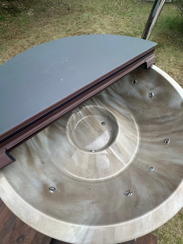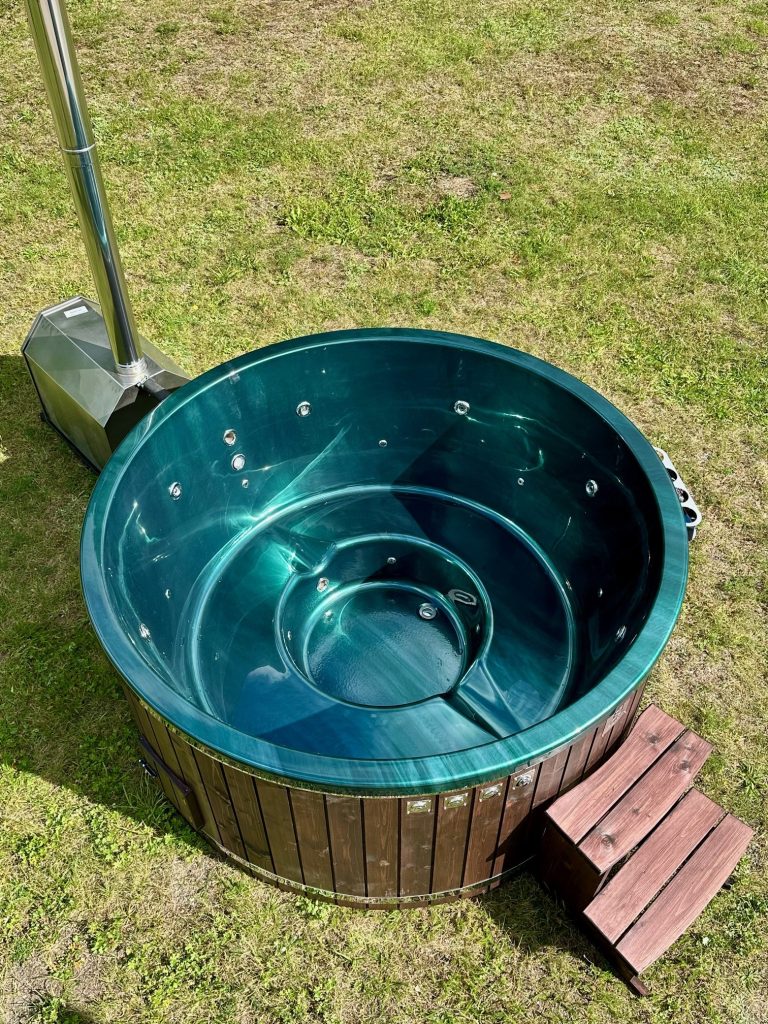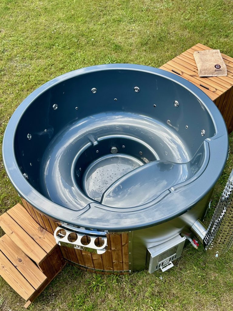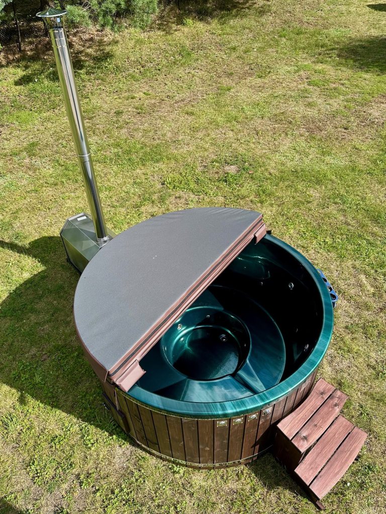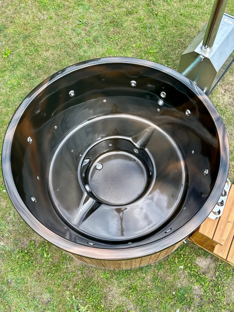 Integrerade kaminer ger snabbare uppvärmning än externa vedeldade kaminer eftersom nästan ingen värme går förlorad. En av de största fördelarna är att veden kan matas in utifrån. Detta gör det säkert att lägga på ved och ta bort aska utan att vattnet förorenas. Den integrerade kaminen är dold inne i badtunnan och bildar ett steg (“barnstol”) som barn kan sitta på eller vuxna kan vila på, vilket gör denna badtunna perfekt för familjer.