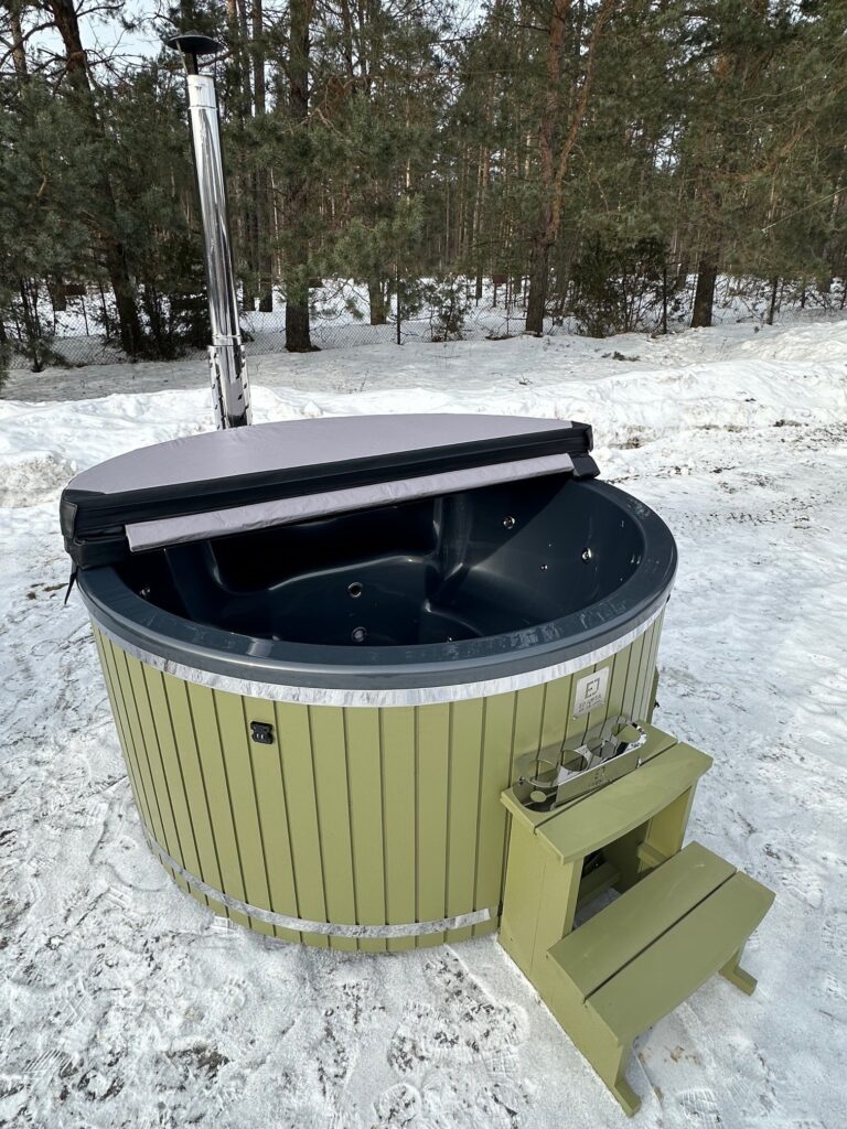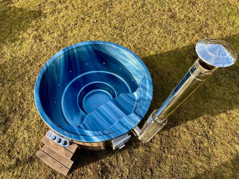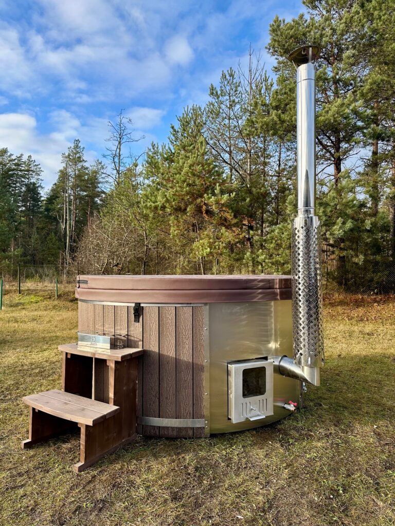 En extern kamin ger mer plats i badtunnan och är mer barnvänlig eftersom kaminen installeras utanför tunnan. Dock krävs mer utrymme för installation. Insidan av badtunnan blir enklare att rengöra, och askan kan tas bort utan att vattnet förorenas. Uppvärmningstiden blir något längre (ca 30 minuter mer än med integrerad kamin). Externa kaminer är också något dyrare, och vid risk för frost måste kaminen tömmas på vatten.