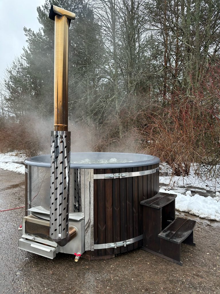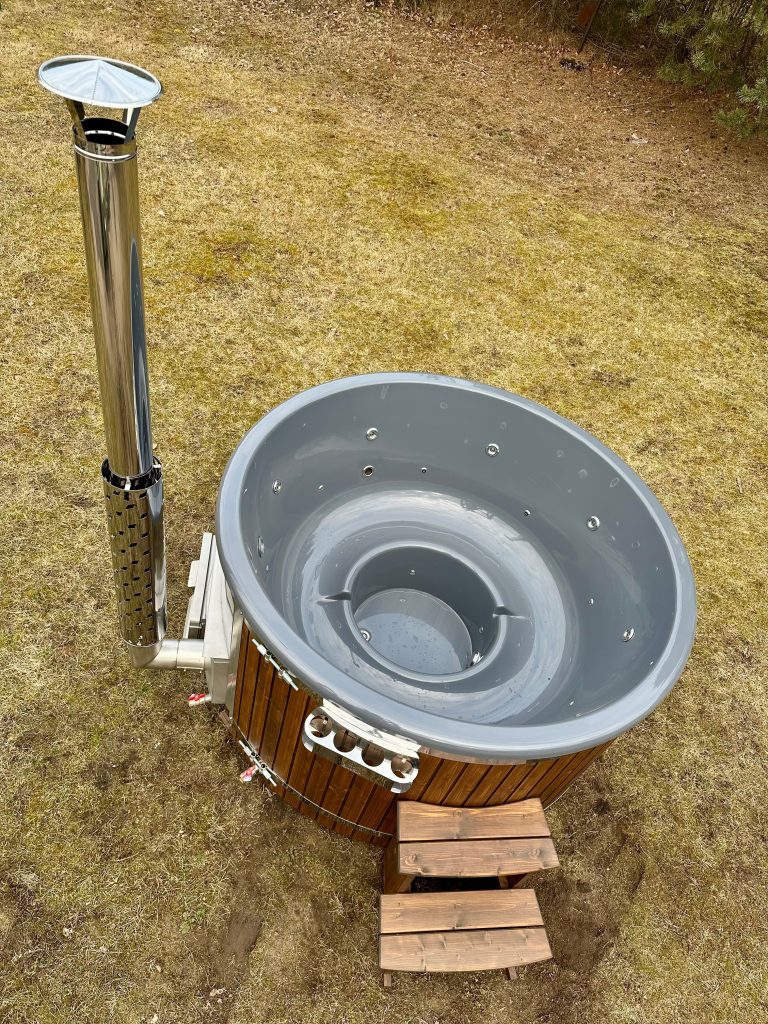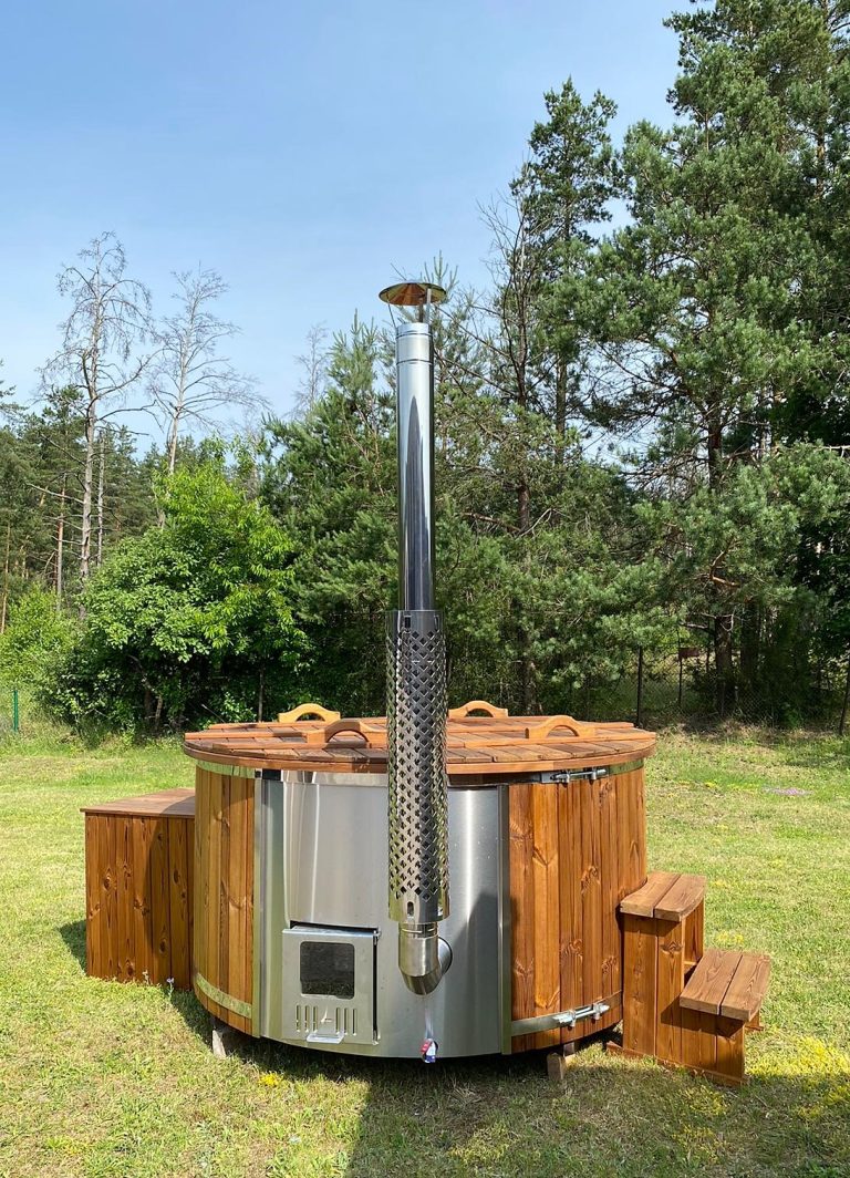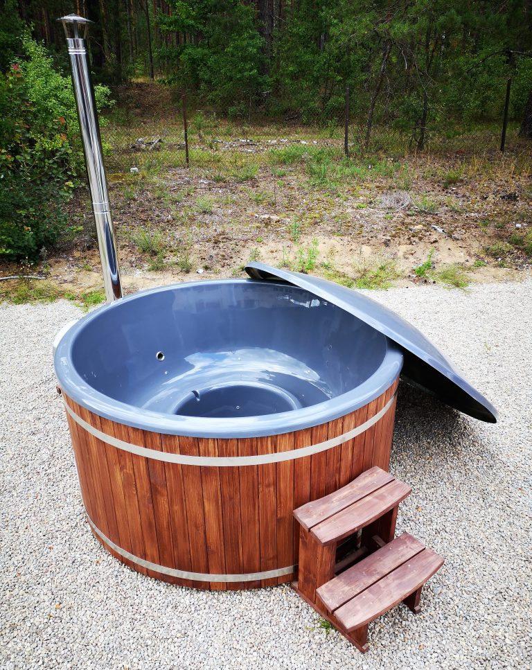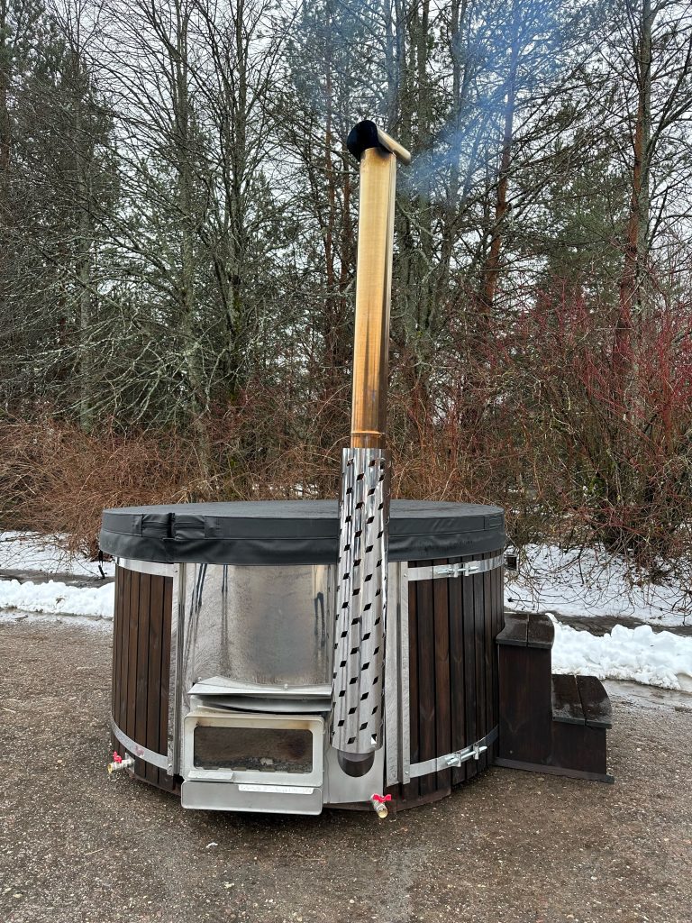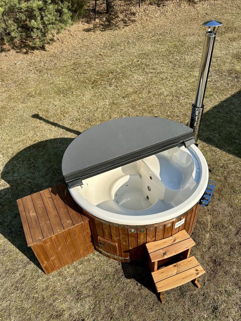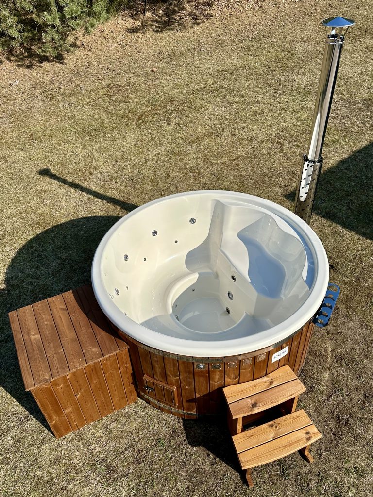 En intern värmare ger en snabbare uppvärmningstid än en extern vedeldad kamin eftersom det nästan inte finns något värmeförlust. Den interna kaminen förbrukar cirka 25% av badtunnans utrymme, men en träbadtunna på 180 cm kan fortfarande rymma upp till 6 personer. En intern värmare ger en mer mysig känsla eftersom du kan sitta nära elden, men det finns också några nackdelar – interna värmare kan vara farliga för barn och det tar längre tid att rengöra dem.