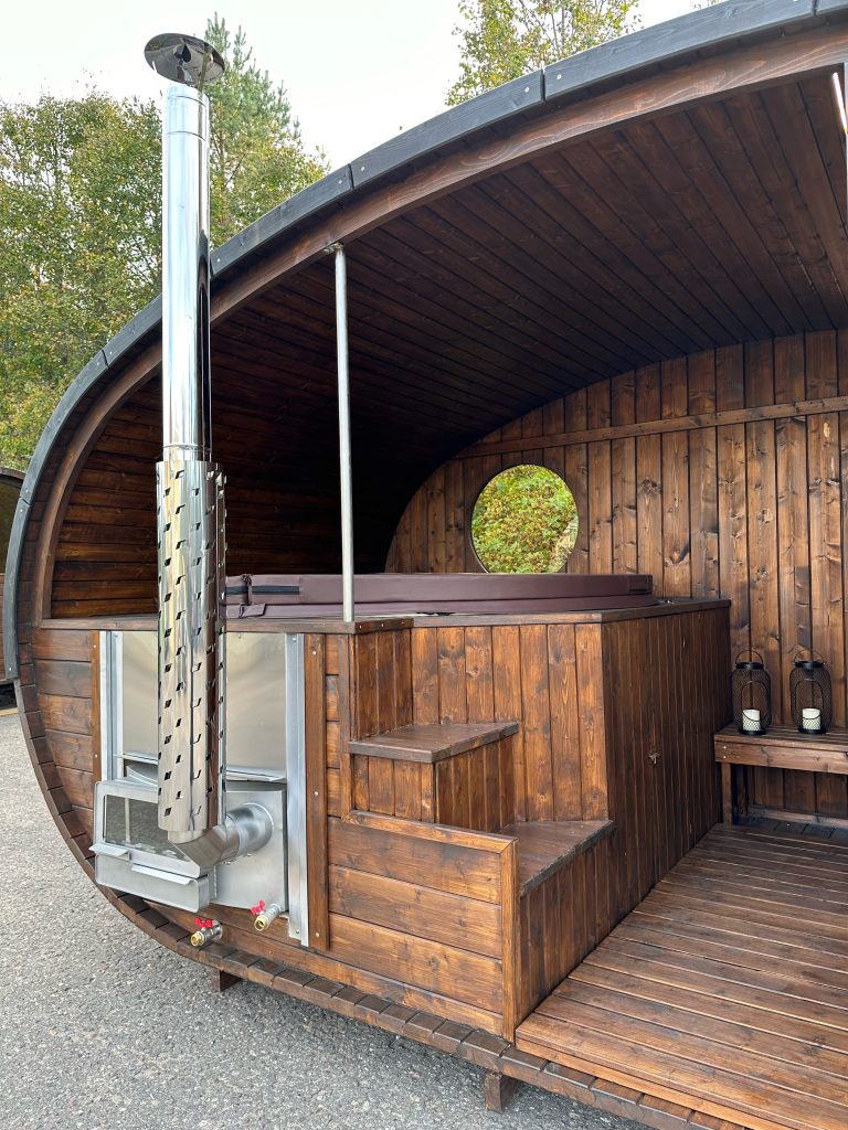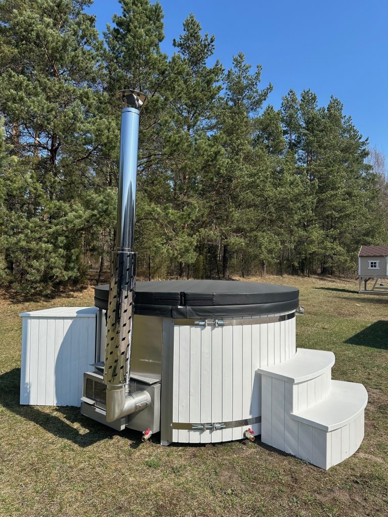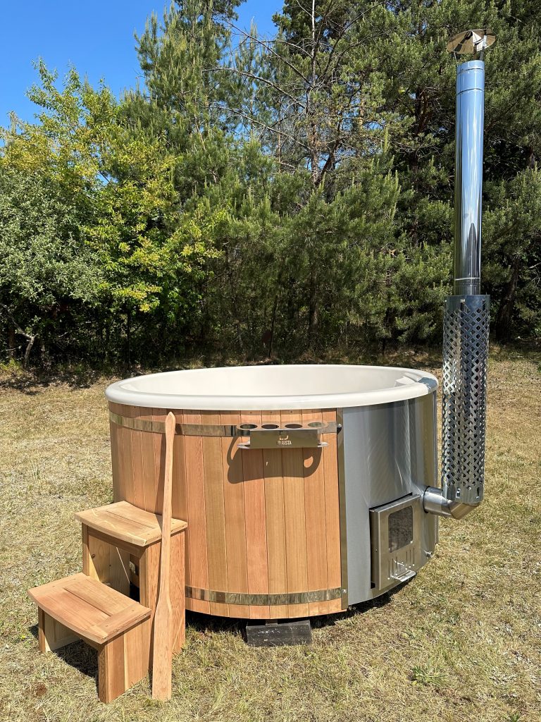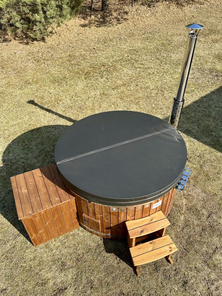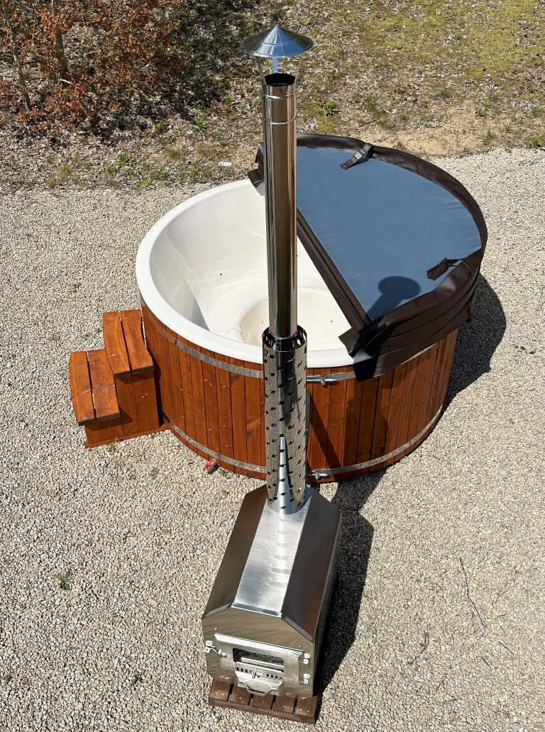 En extern vedeldad värmare erbjuder mer utrymme i badtunnan och är också mer barnvänlig eftersom spisen installeras utanför badtunnan. Du kommer dock att behöva mer plats för att installera den. Det tar mindre tid att rengöra insidan av badtunnan, och det är också lättare att ta bort askan från den externa värmaren utan att förorena vattnet. Uppvärmningstiden för badtunnan blir något längre (cirka 30 minuter extra jämfört med en intern värmare). Externa värmare är också något dyrare, och dessutom måste du se till att värmaren töms om du förväntar dig frost.