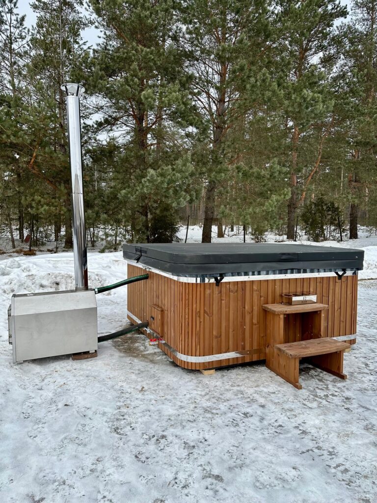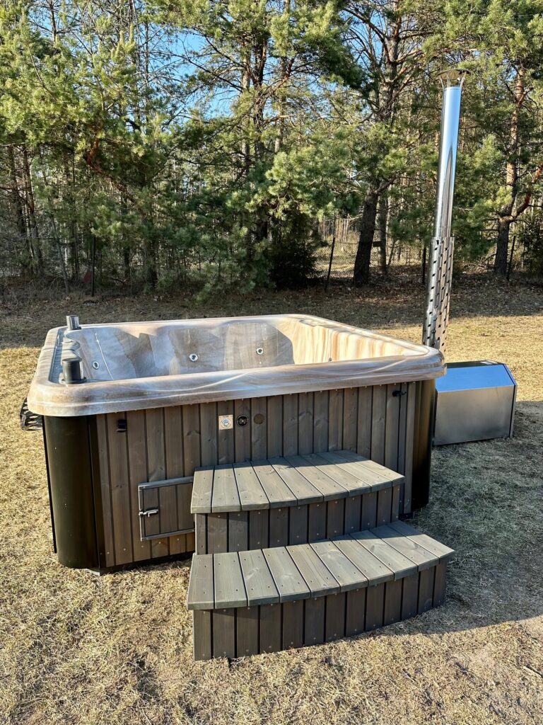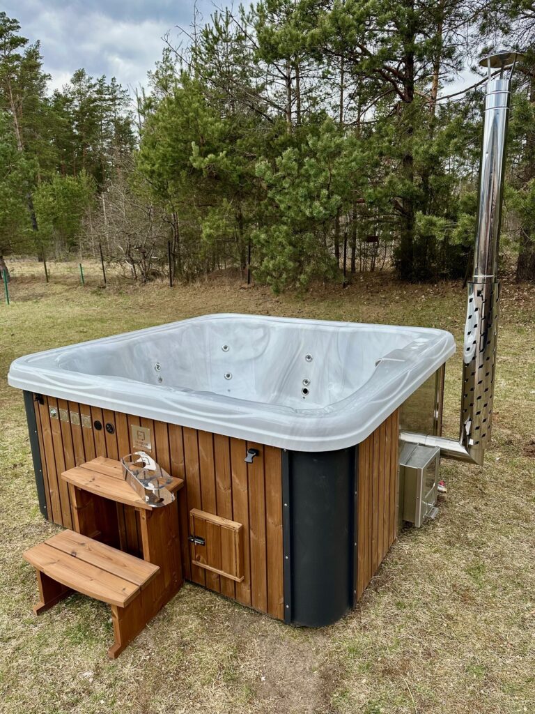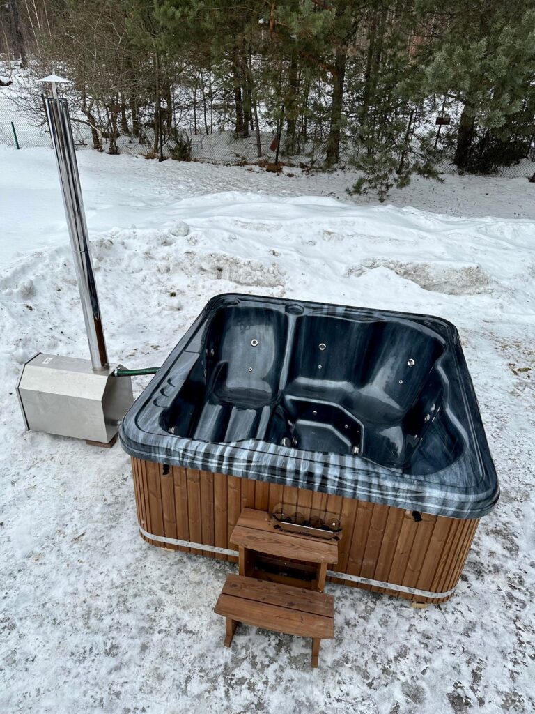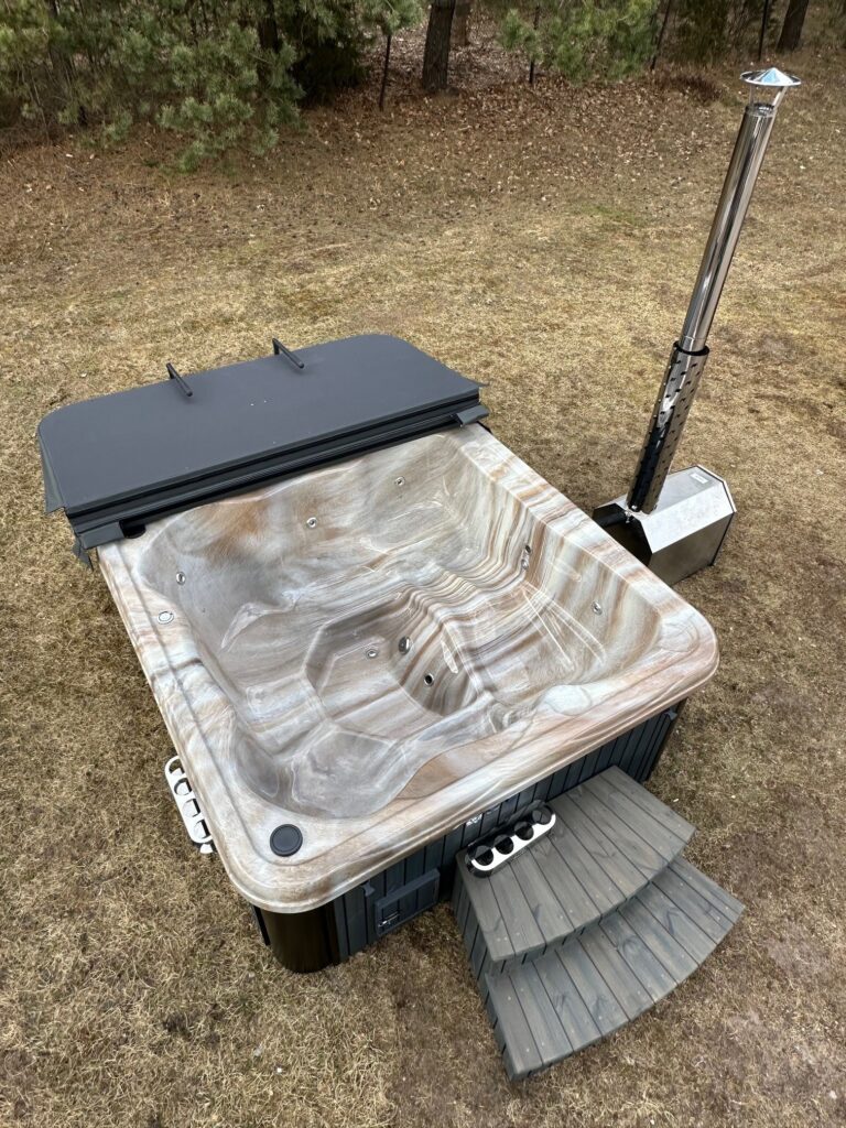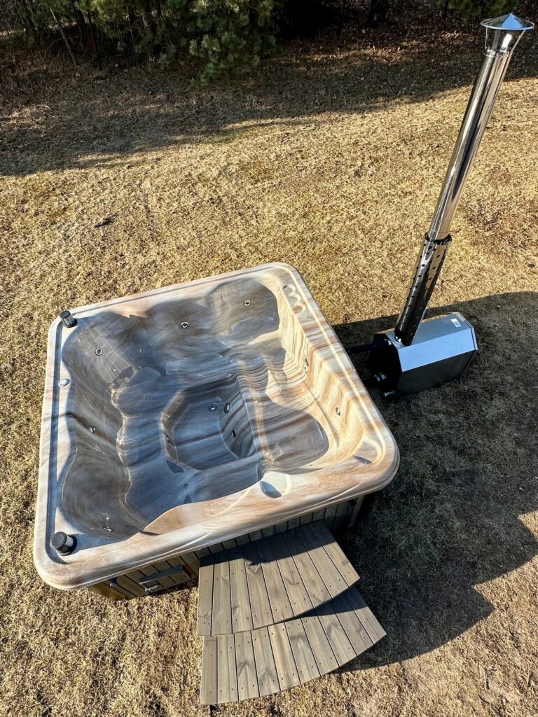 Fyrkantigt badkar – en rymlig och modern modell som kombinerar funktionalitet med modern design. Den kan göras med antingen en akryl- eller plastinsats: akrylinsatsen, formad med vakuumteknik, är lätt att underhålla, mycket hållbar och reptålig, samtidigt som dess ergonomiska form ger optimal komfort. Plastinsatsen, tillverkad av slitstark polypropylen, erbjuder ett större urval av storlekar och utmärkt motståndskraft mot olika miljöfaktorer. En träfinish på utsidan ger ett naturligt estetiskt utseende, medan den inre insatsen gör underhållet enkelt. Fyrkantiga badkar kan värmas med integrerade eller externa vedeldade kaminer, eller elektriska värmare, vilket gör dem till ett pålitligt, modernt och mycket bekvämt val.