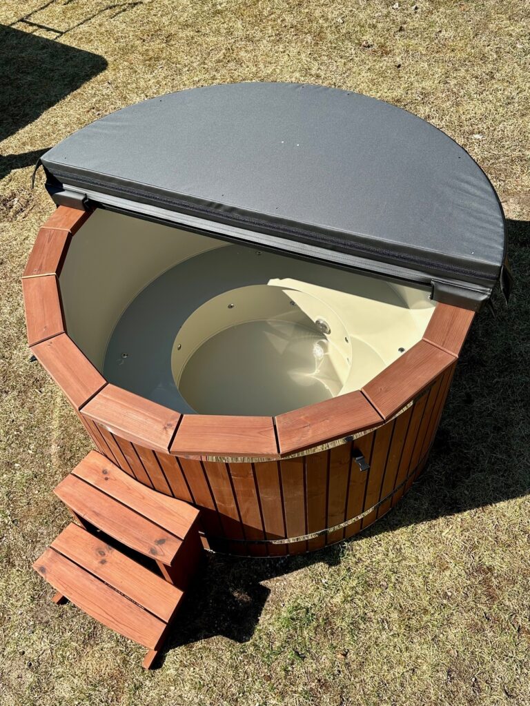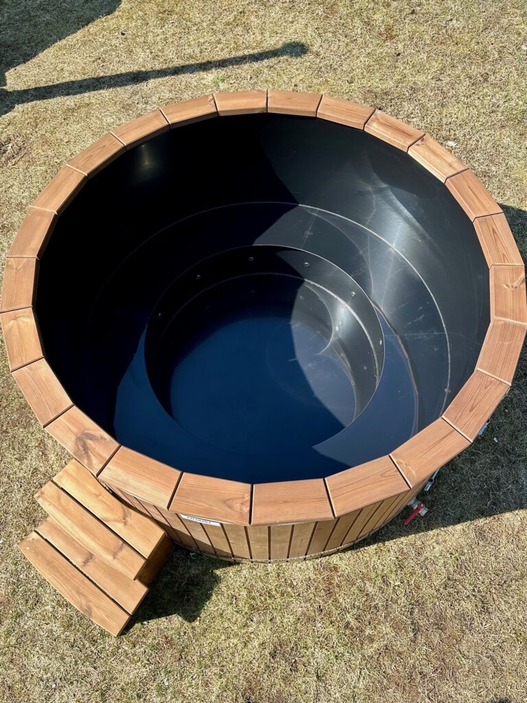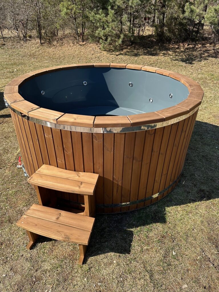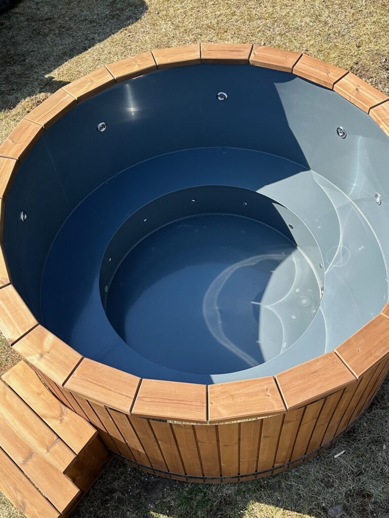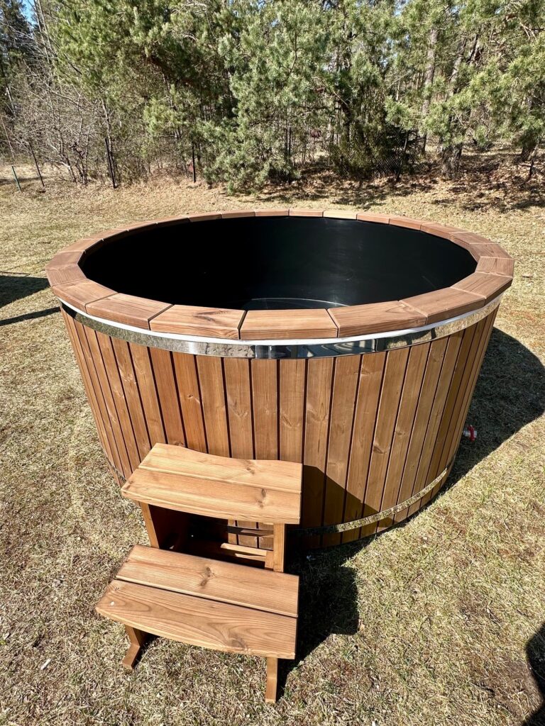 Dessa badtunnor har plastinlägg tillverkade av högkvalitativ polypropen, som används för att tillverka utomhuspooler. Det är motståndskraftigt mot kallt väder, UV-strålar och andra miljöförhållanden. Plastbadtunnor är mer hygieniska än träbadtunnor eftersom du kan tömma vattnet från en tunna varje gång efter användning, samtidigt som du behåller den naturliga träbadtunne-looken på utsidan.