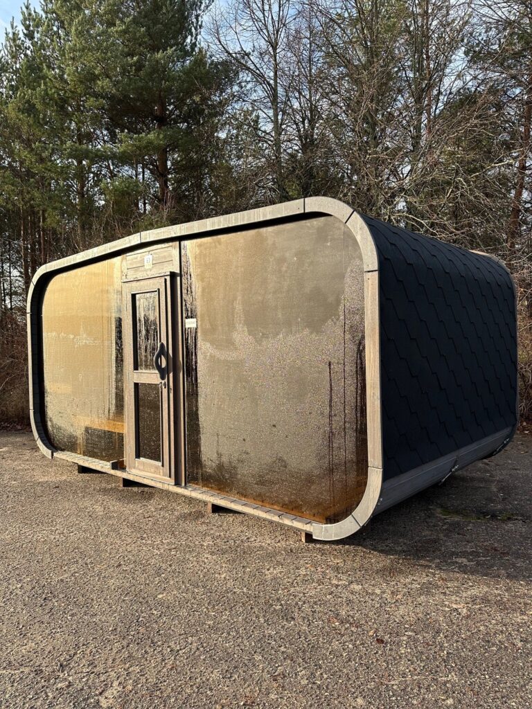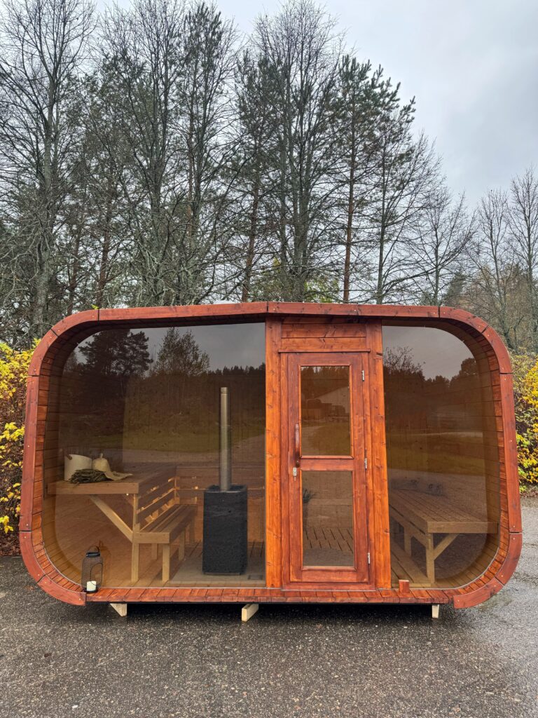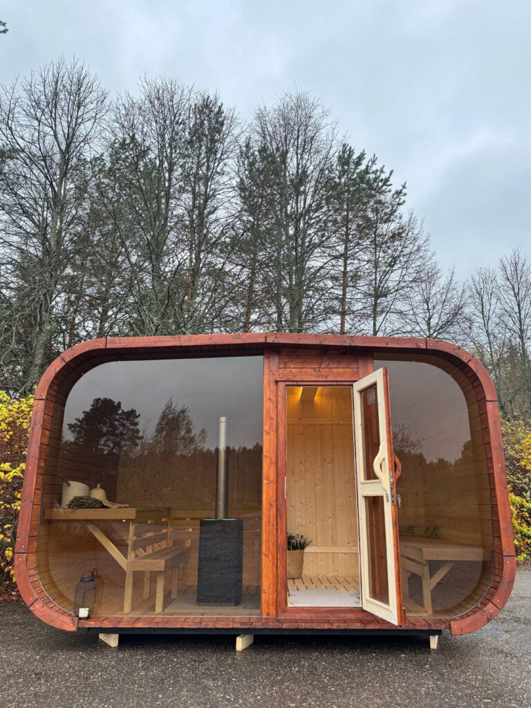 Bastu Cabin har en samtida design med en modern form och utmärker sig med sina stora panoramafönster som skapar en rymlig känsla och låter dig njuta av den underbara utsikten. Den praktiska planlösningen möjliggör tillägg av ett bekvämt omklädningsrum, som kan användas som en avkopplingsyta eller för förvaring. Stilren, funktionell och mysig – denna bastu blir en perfekt plats för avkoppling och värme året om.