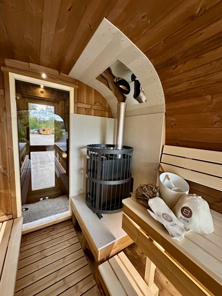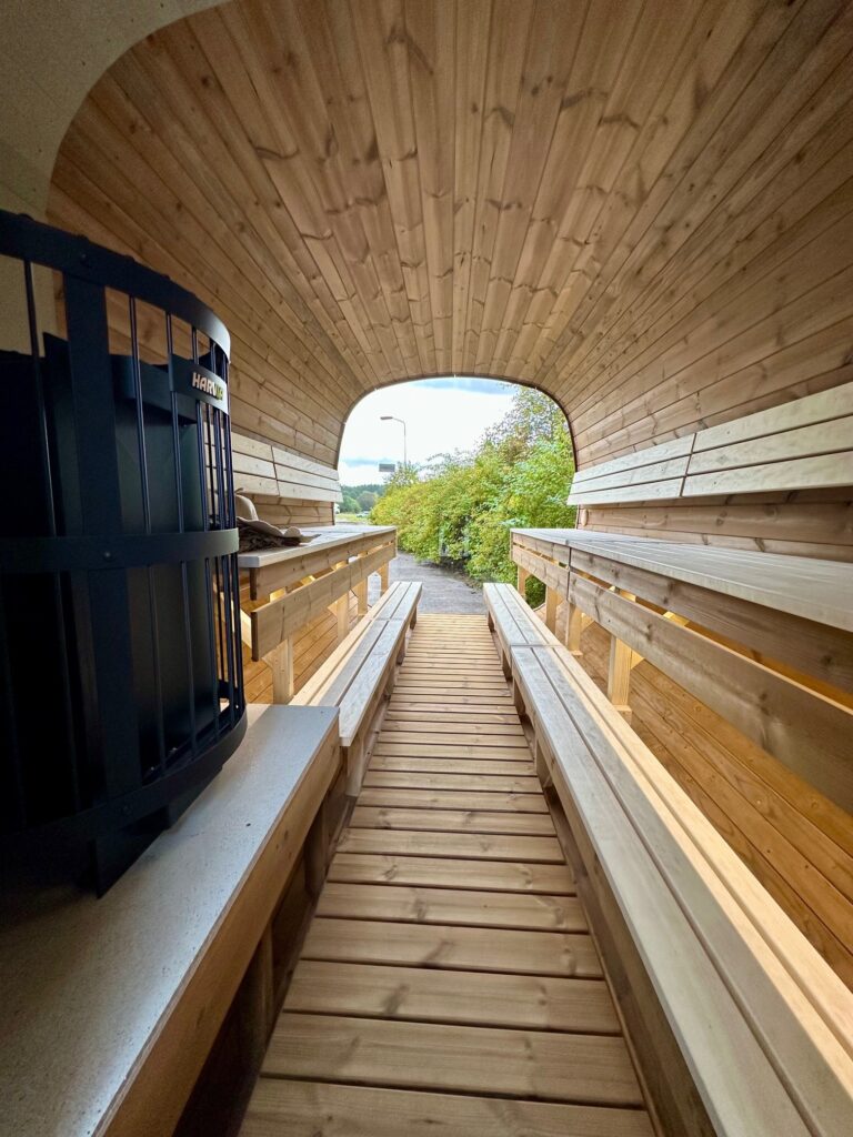 - Vedeldad värmare med extern vedmatning utifrån eller från omklädningsrummet.