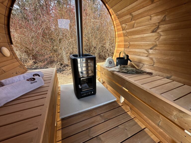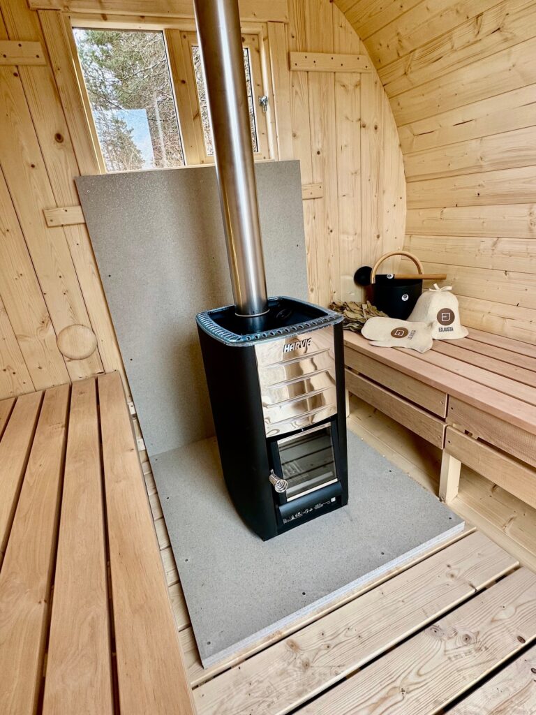 - Vedeldad värmare med extern vedmatning utifrån eller från omklädningsrummet.
