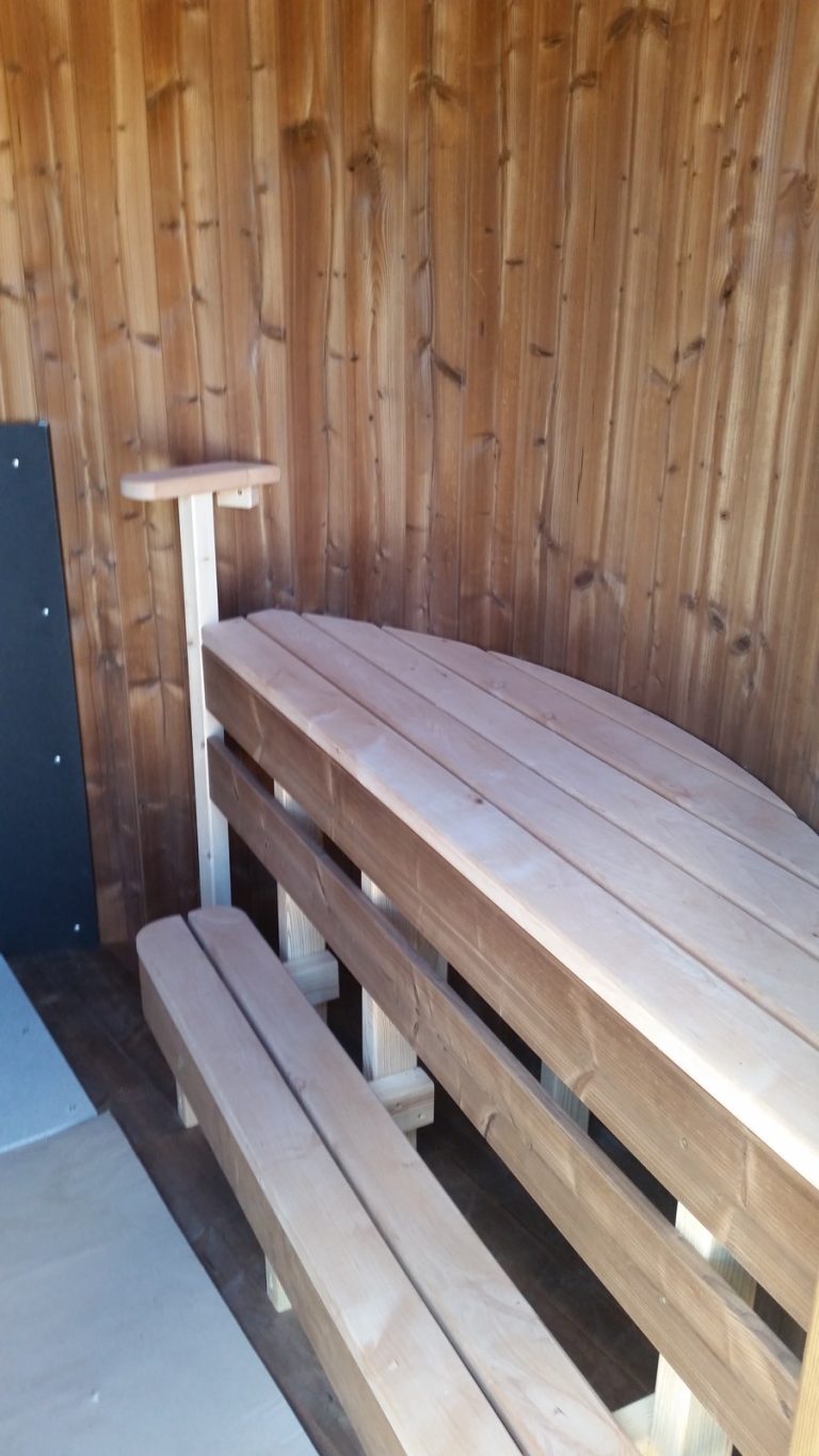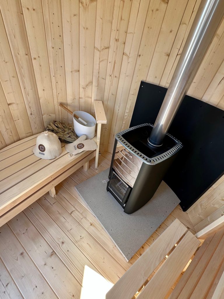 - Vedeldad värmare med extern vedmatning utifrån eller från omklädningsrummet.